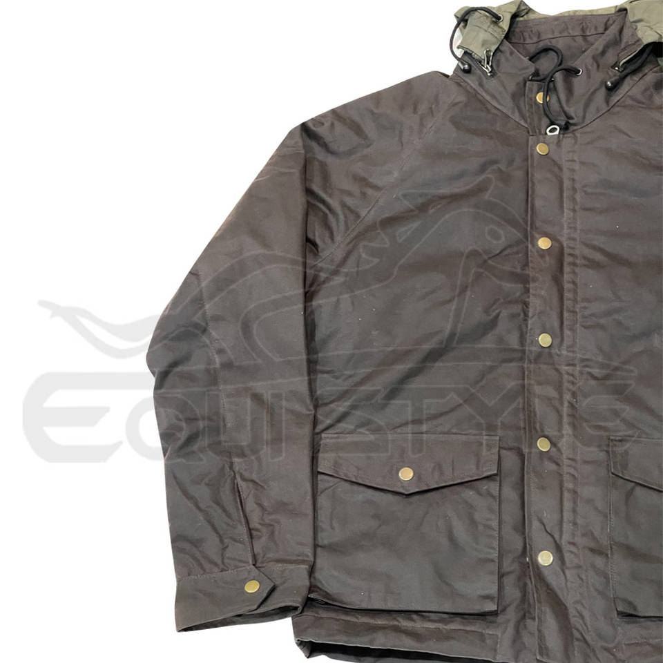 เสื้อแจ็คเก็ตสำหรับล่าสัตว์สีน้ำตาลขายส่ง กางเกงยีนส์เคลือบน้ำมัน เสื้อกันลมมีฮู้ดสำหรับฤดูหนาว โลโก้สั่งทำ OEM เสื้อผ้ากีฬากลางแจ้งสำหรับล่าสัตว์ ขายส่งจำนวนมาก