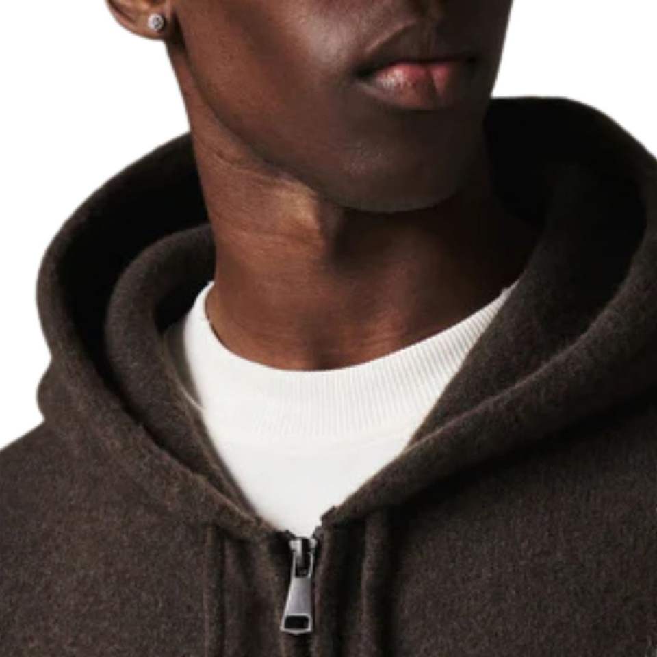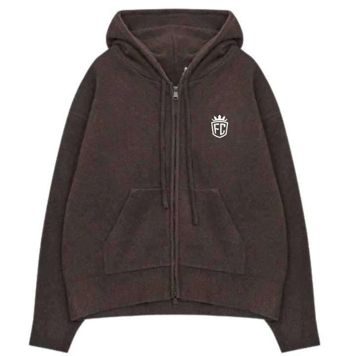 เสื้อฮู้ดไหมพรมสีน้ำตาลแบบซิปพร้อมตราสัญลักษณ์ เสื้อผ้าลำลองแสนสบายสำหรับผู้ชายและผู้หญิง เสื้อฮู้ดซิปมีโลโก้เพื่อความสบายในชีวิตประจำวัน