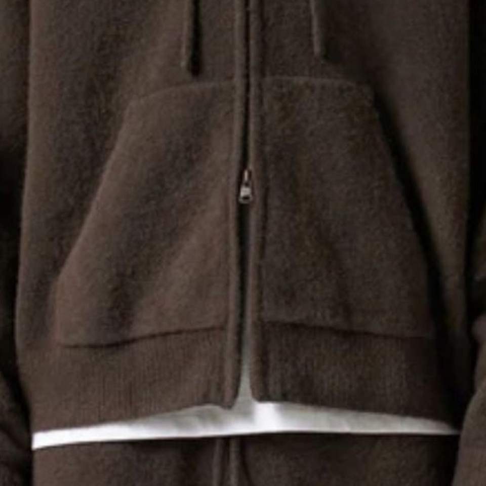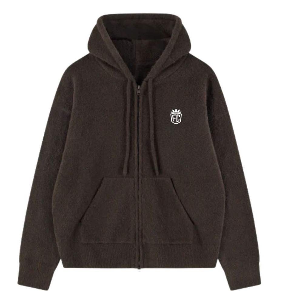 เสื้อฮู้ดไหมพรมสีน้ำตาลแบบซิป มีตราสัญลักษณ์ เสื้อฮู้ดทันสมัยและสวมใส่สบายสำหรับผู้ชายและผู้หญิง เหมาะสำหรับใส่ลำลองในฤดูหนาว มีโลโก้
