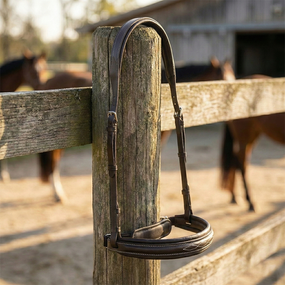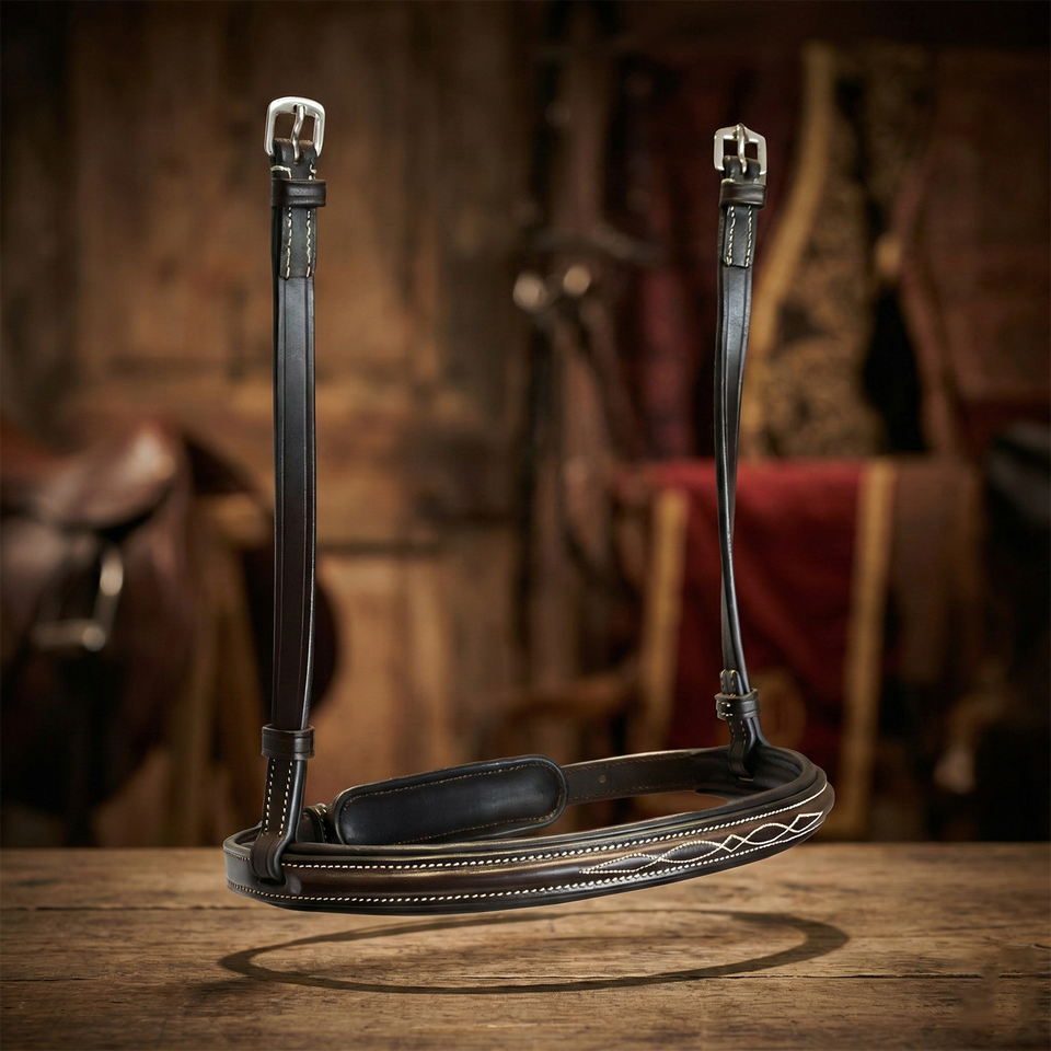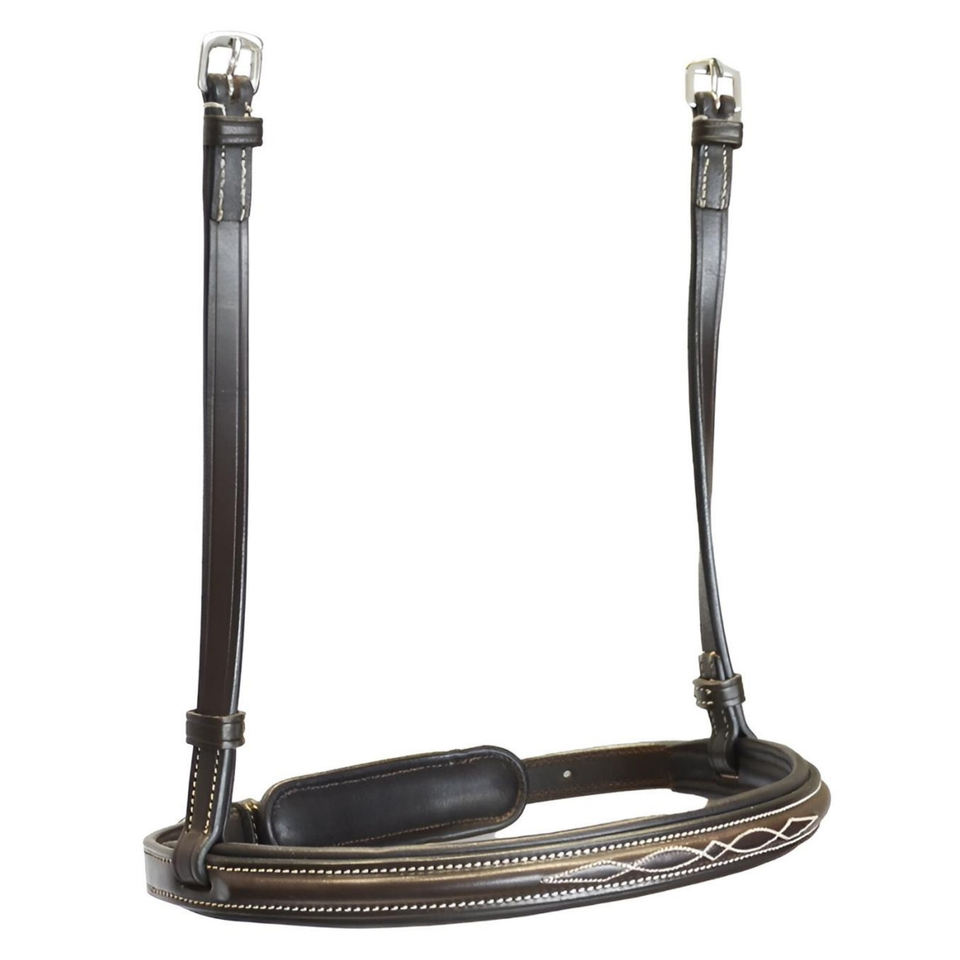 สายรัดจมูกม้าหนังอินเดียสีดำ ตกแต่งด้วยการเย็บสีขาว บุนวมตรงกลาง ปรับได้ด้วยหัวเข็มขัด สายรัดม้าคุณภาพพรีเมียม