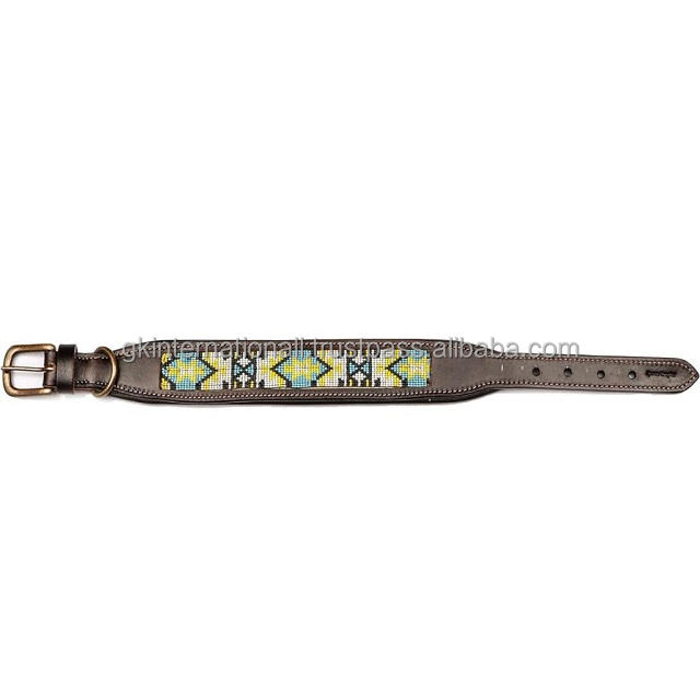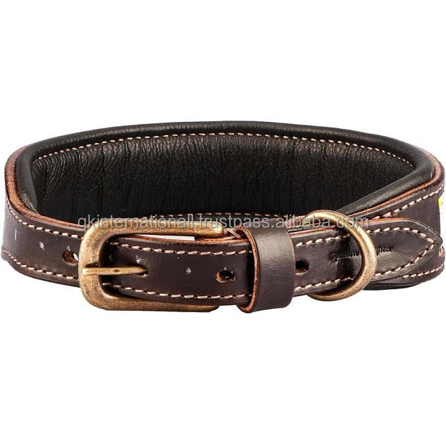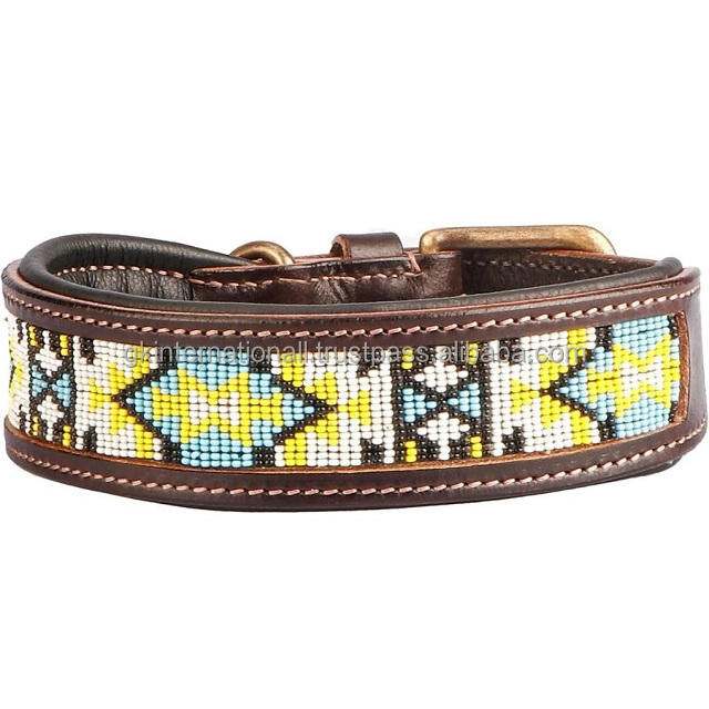 ปลอกคอสุนัขบุนวมหนังสีน้ําตาลหลากสีตกแต่งปลอกคอสัตว์เลี้ยงสุนัขลูกปัดพร้อมฮาร์ดแวร์ปรับได้ชุบทองเหลืองโบราณ