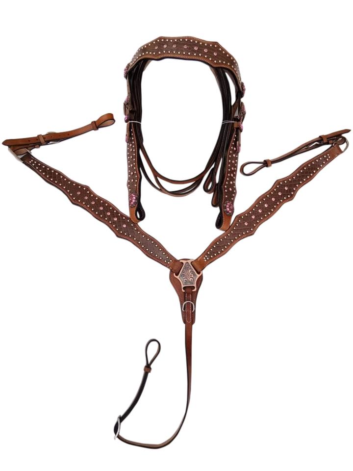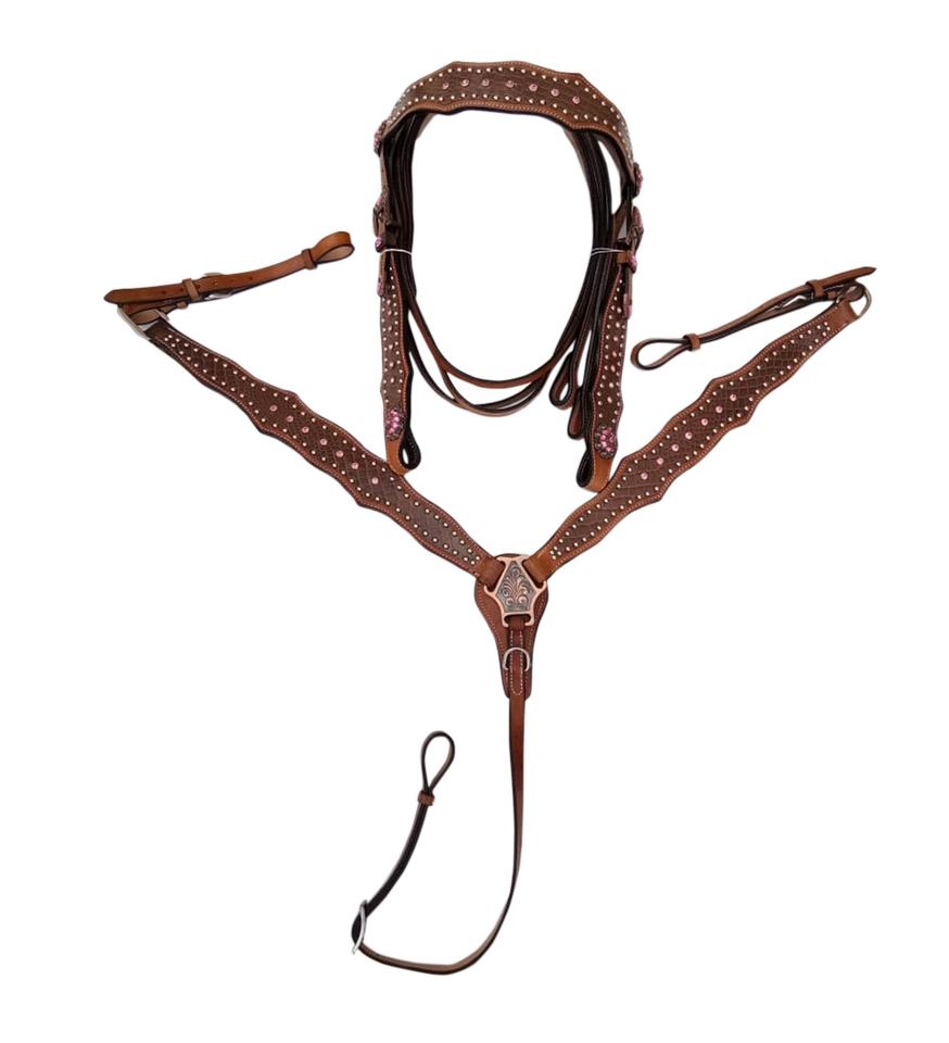 ชุดหูฟังและแผ่นรองหน้าอกหนังสีน้ำตาลสไตล์ตะวันตกพร้อมดีไซน์คริสตัลและคอนโชสีชมพูสำหรับเจ้าของม้า