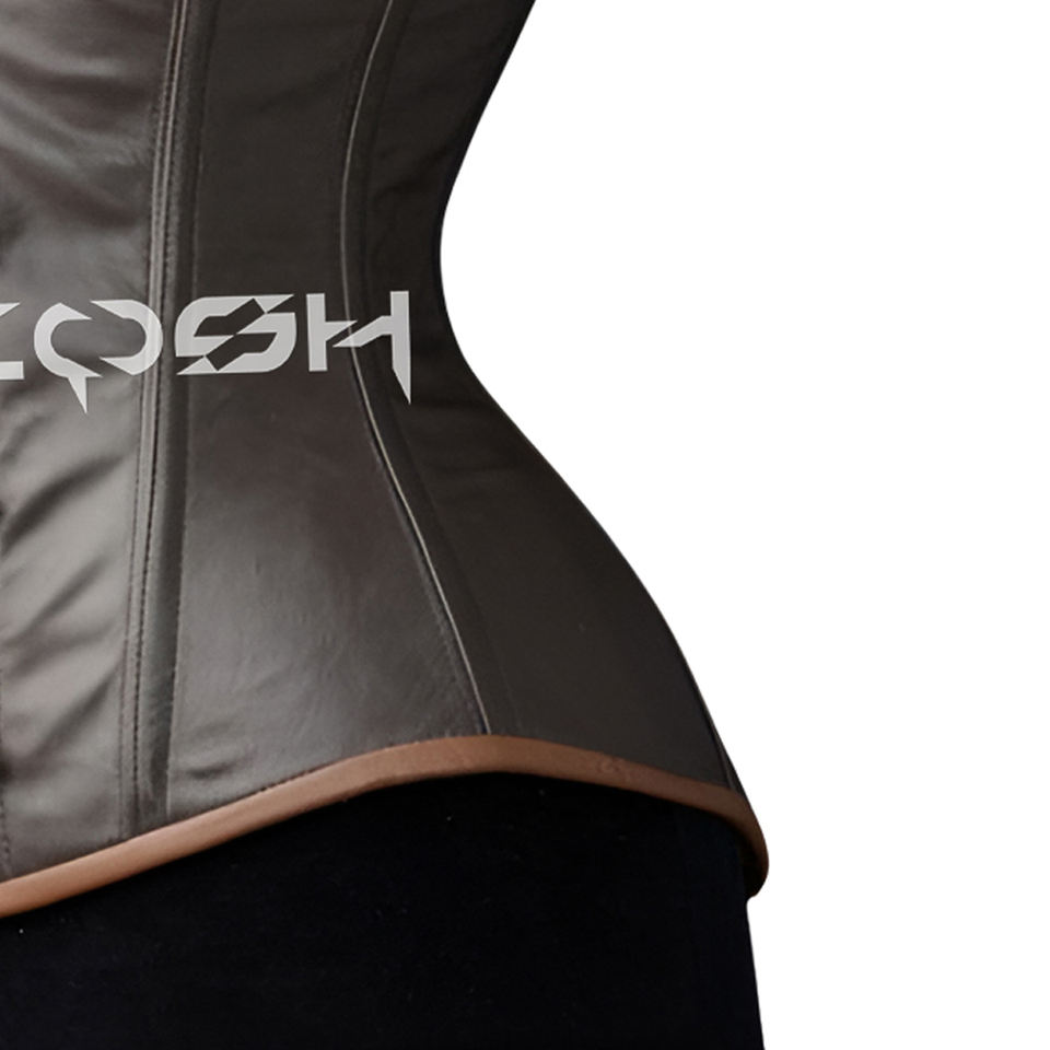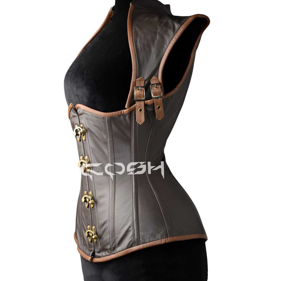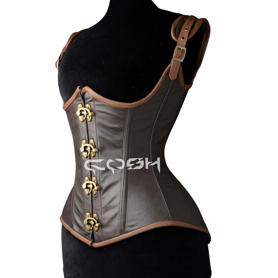 คอร์เซ็ทหนังสีน้ำตาลแบบรัดใต้อกพร้อมสายรัดไหล่คอสเพลย์และคอร์เซ็ทสำหรับแต่งกาย