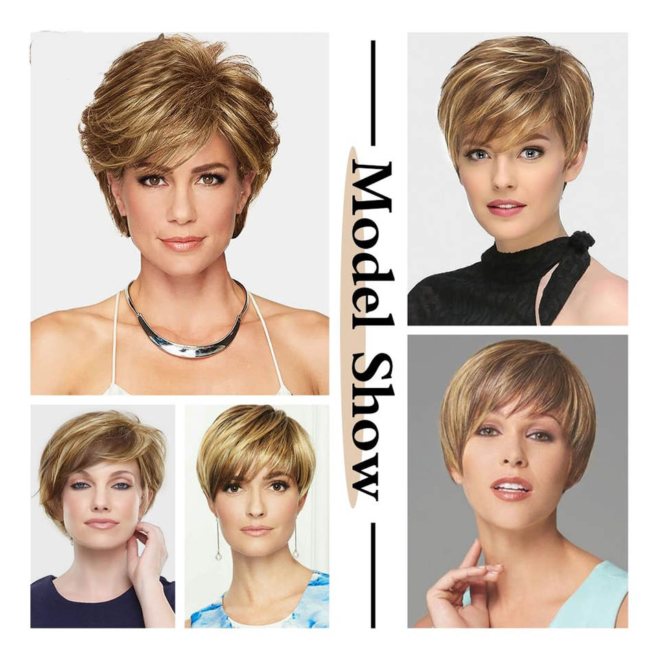 วิกผมสังเคราะห์สีน้ำตาลผสมสีบลอนด์สำหรับผู้หญิงวิกผมสั้นดูเป็นธรรมชาติสำหรับวันฮาโลวีน