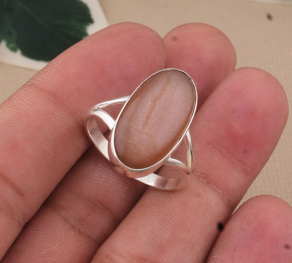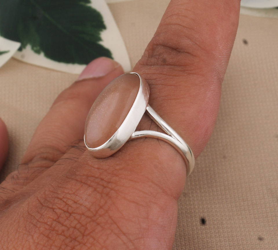 แหวนมูนสโตนสีน้ำตาลรูปวงรีแหวนเงินสเตอลิง925แหวนมินิมอลทำมือแหวน Boho ของขวัญอัญมณีสำหรับเธอ