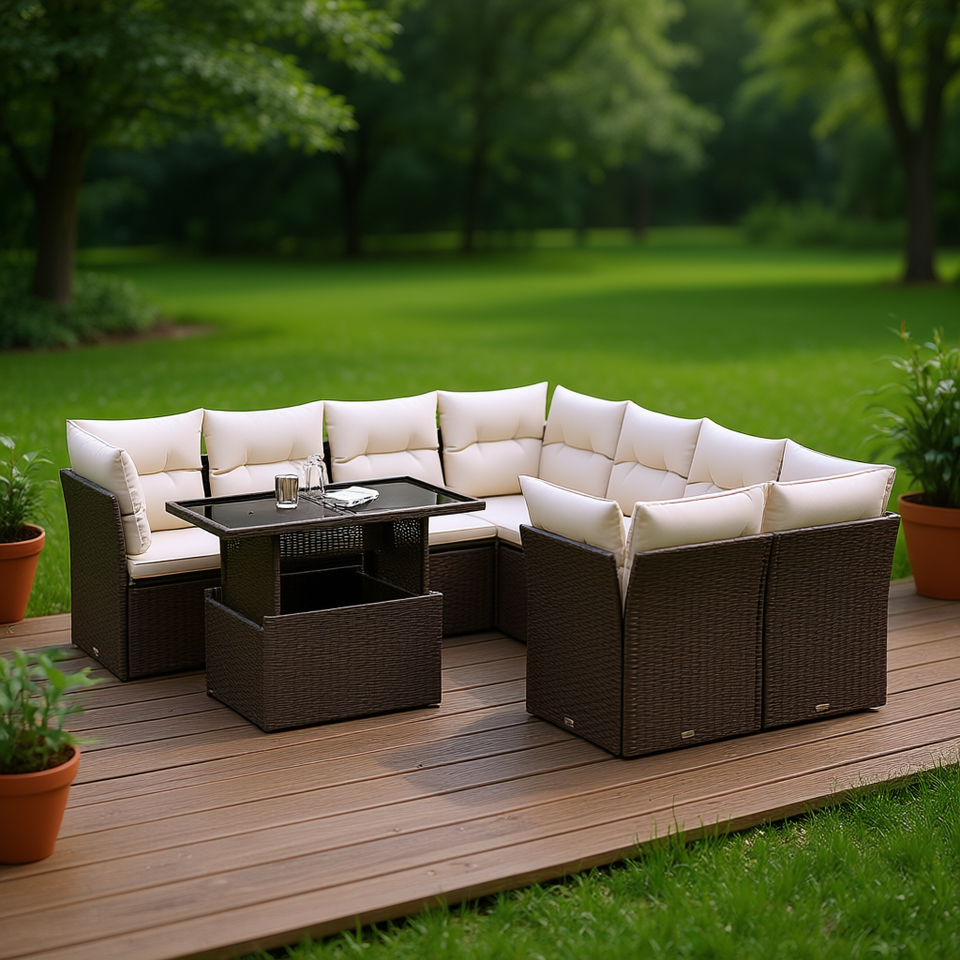 ชุดโซฟาหวายสีน้ำตาล 9 ชิ้น ปรับที่วางแขนได้ เฟอร์นิเจอร์กลางแจ้ง ดีไซน์ร่วมสมัย