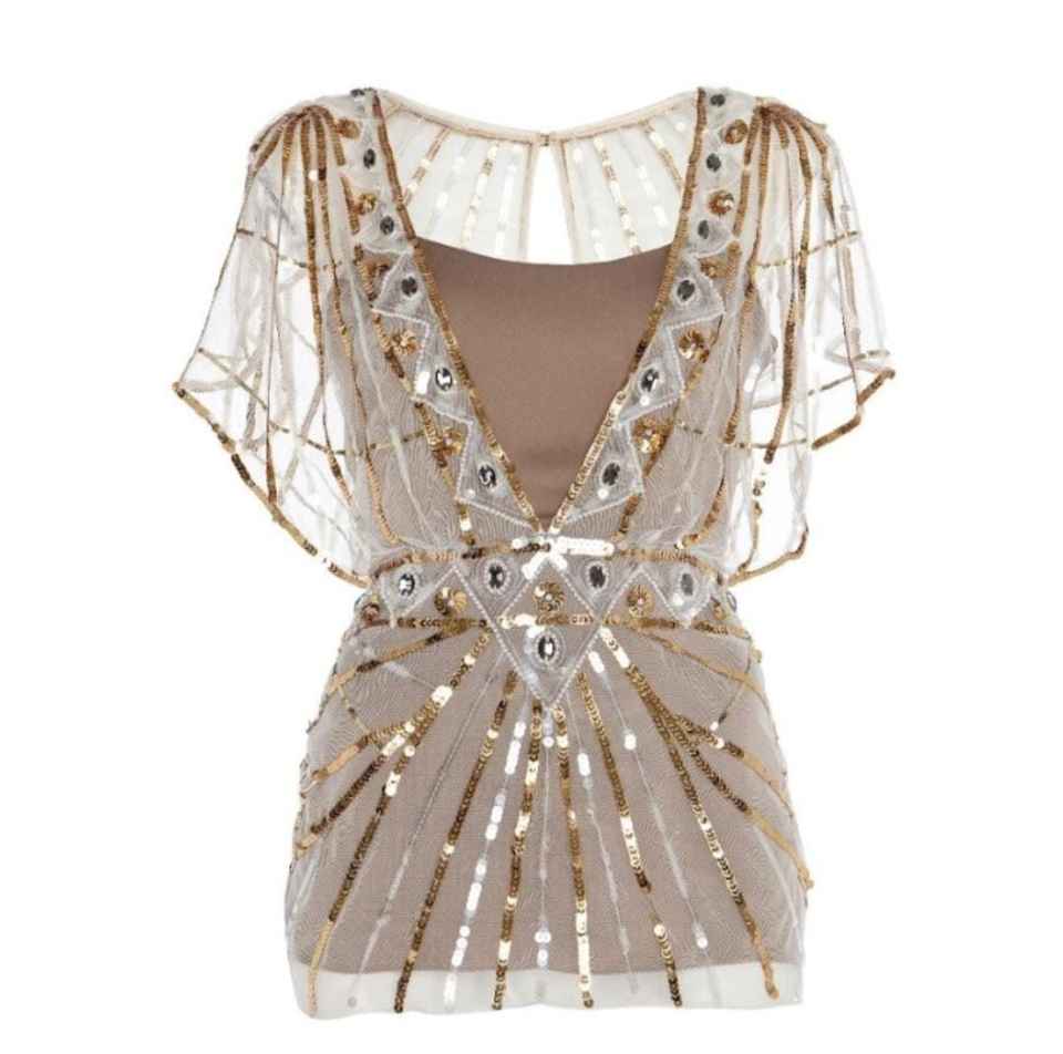 ชุดเดรสสั้นสีน้ำตาลผ้าโพลีเน็ตทรงตรงสำหรับผู้หญิง คอวี ปักเลื่อม เหมาะสำหรับงานปาร์ตี้ฤดูร้อนและงานกลางคืน