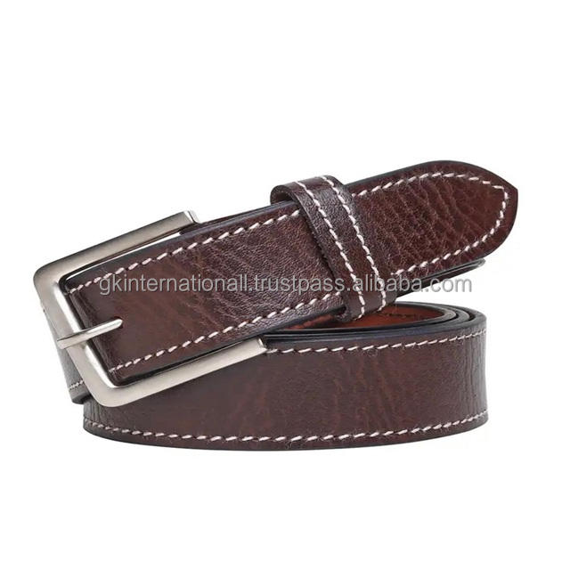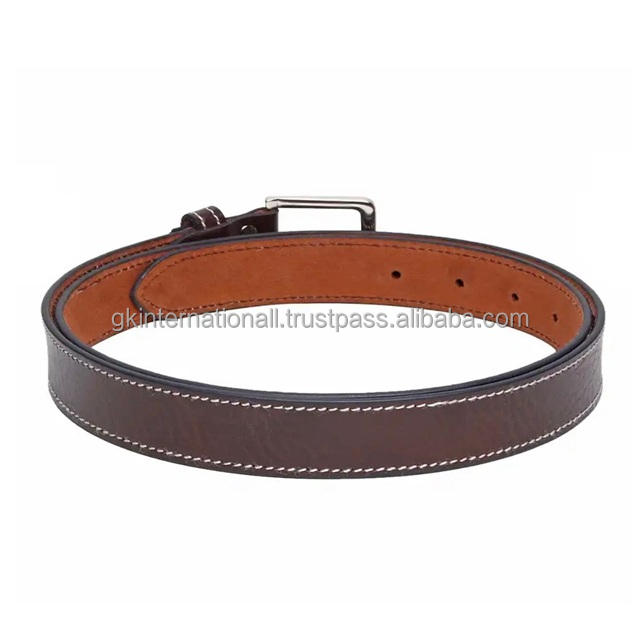 Brown Premium Cowhide Durable Leather Casual Belt for men with White Edge Stitching and Matt Silver brass buckle custom sizes