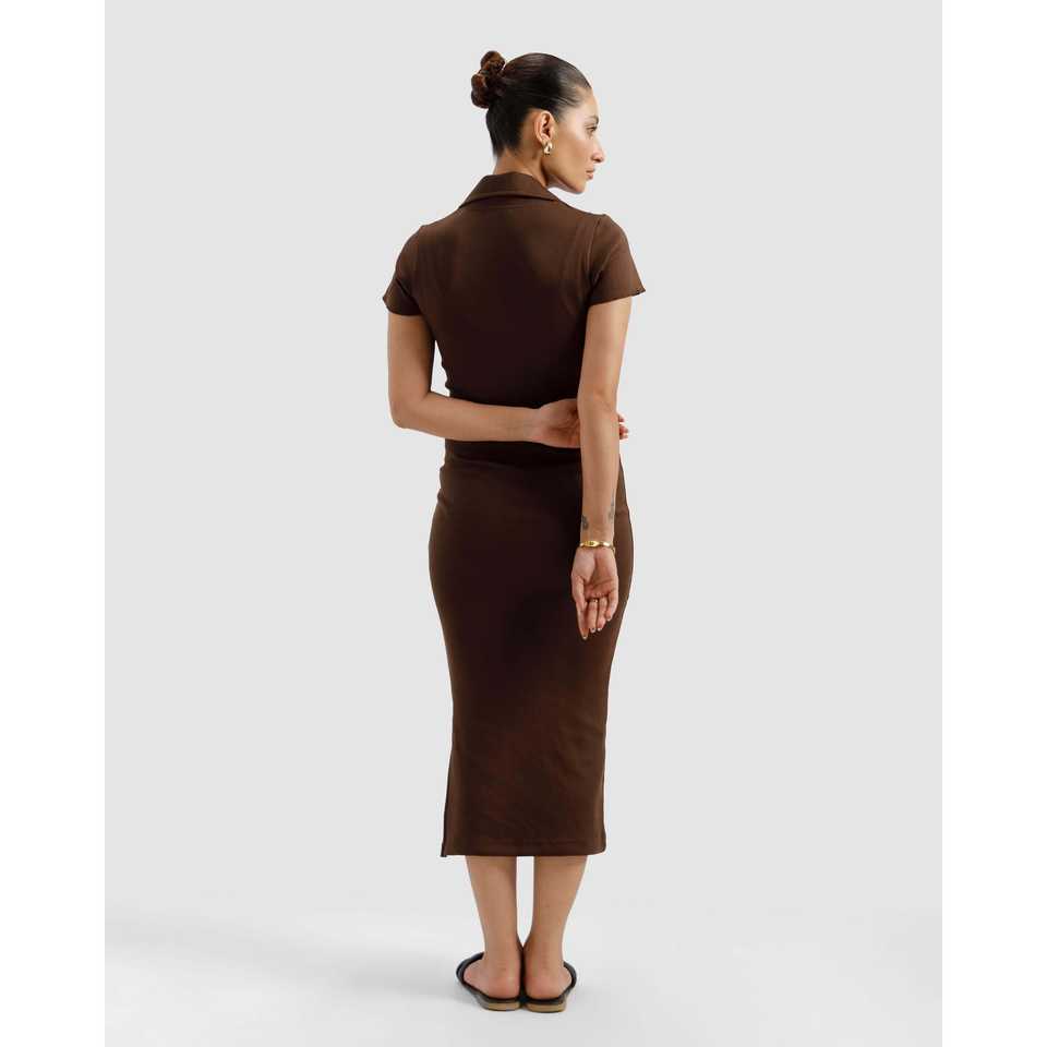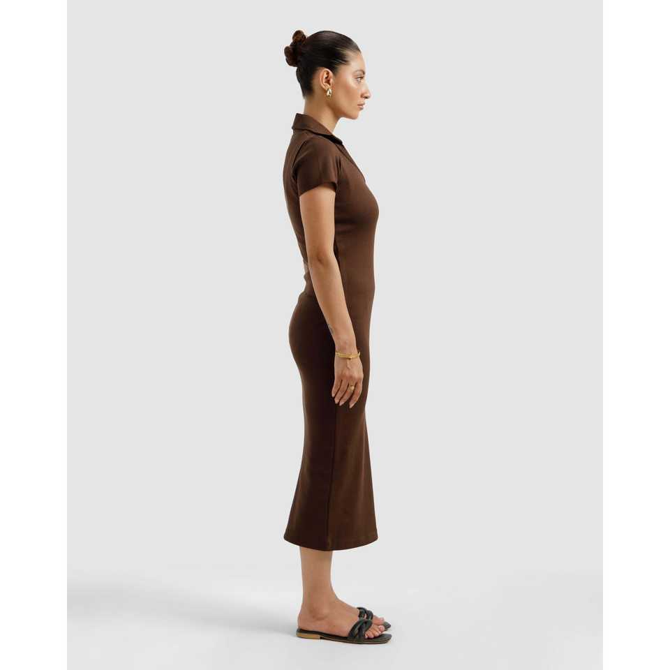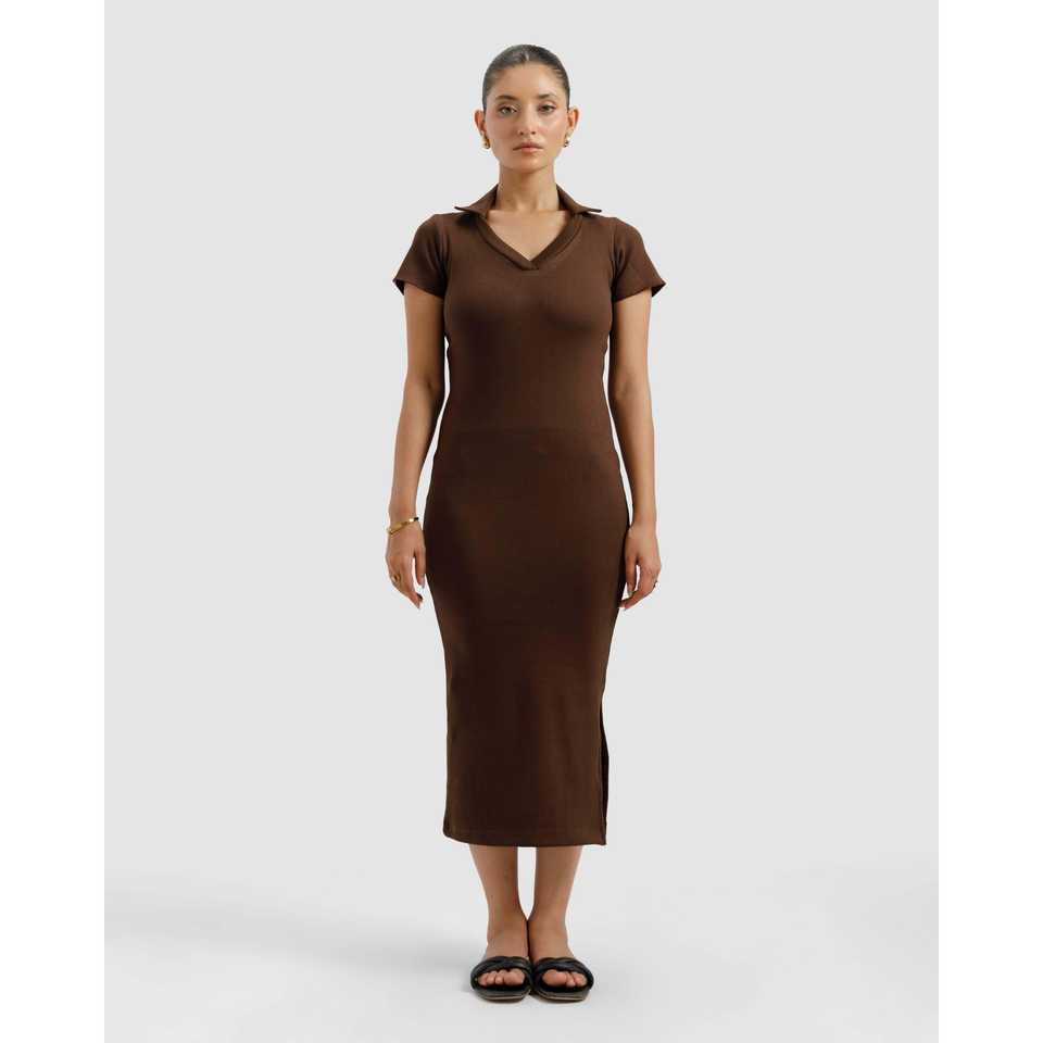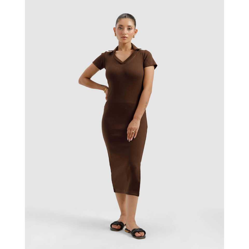 เดรสโปโลสีน้ำตาลลายริบบิ้นสำหรับผู้หญิง ดีไซน์หรูหรา ยาวคลุมเท้า เอวธรรมชาติ ระบายอากาศได้ดี ผ้าผสมแบบโปร่ง ไซส์พลัส ฟรีไซส์ XL