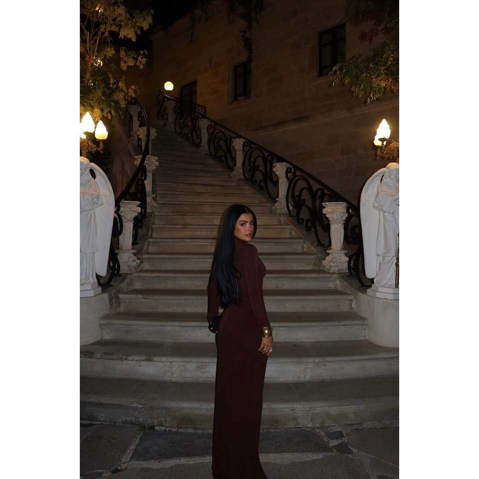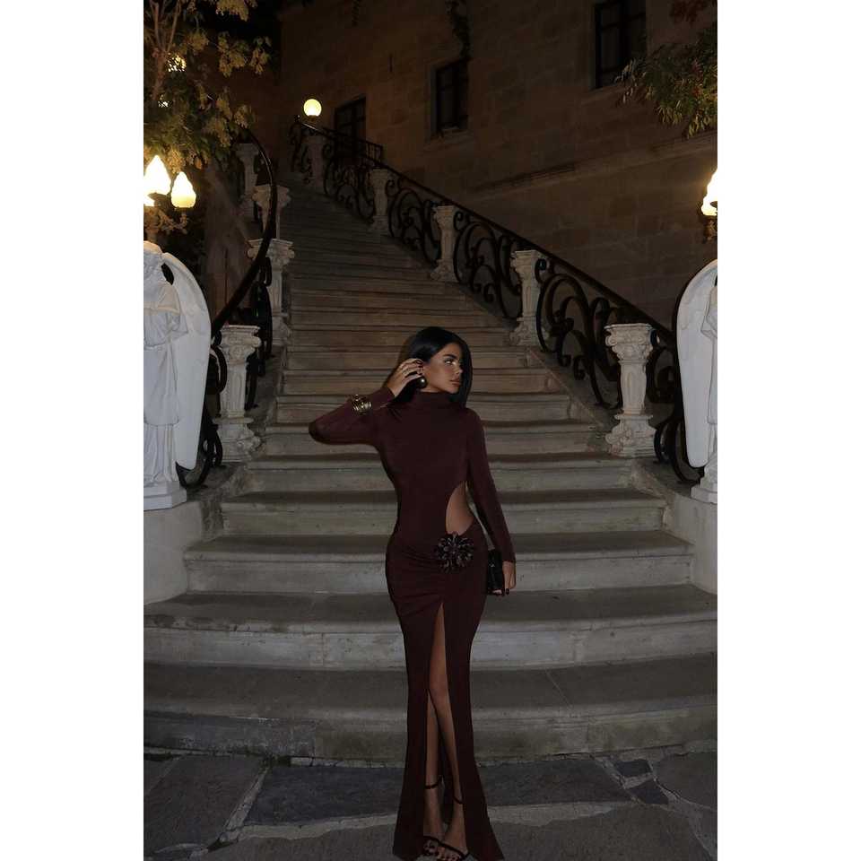 ชุดเดรสยาวลายกุหลาบสีน้ำตาล