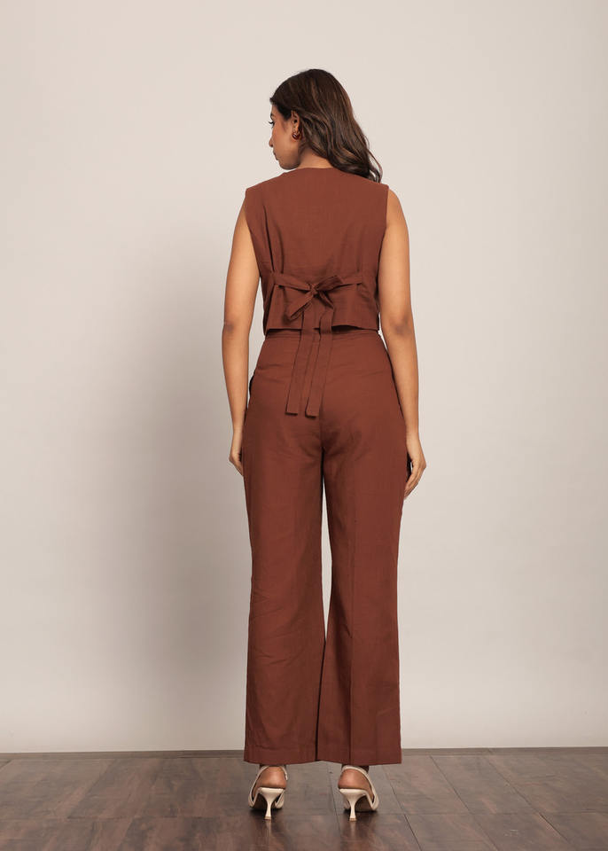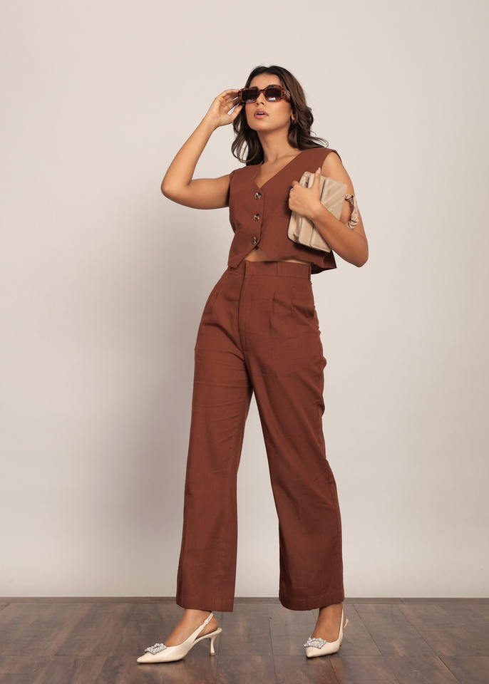 ชุดเสื้อและกางเกงสีน้ำตาลล้วนพร้อมกระดุมคาดเอวแบบธรรมชาติเข็มขัดสานสำหรับตกแต่ง