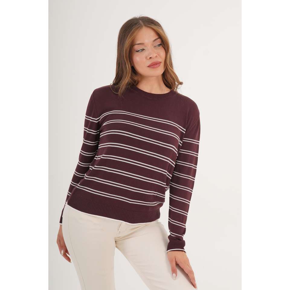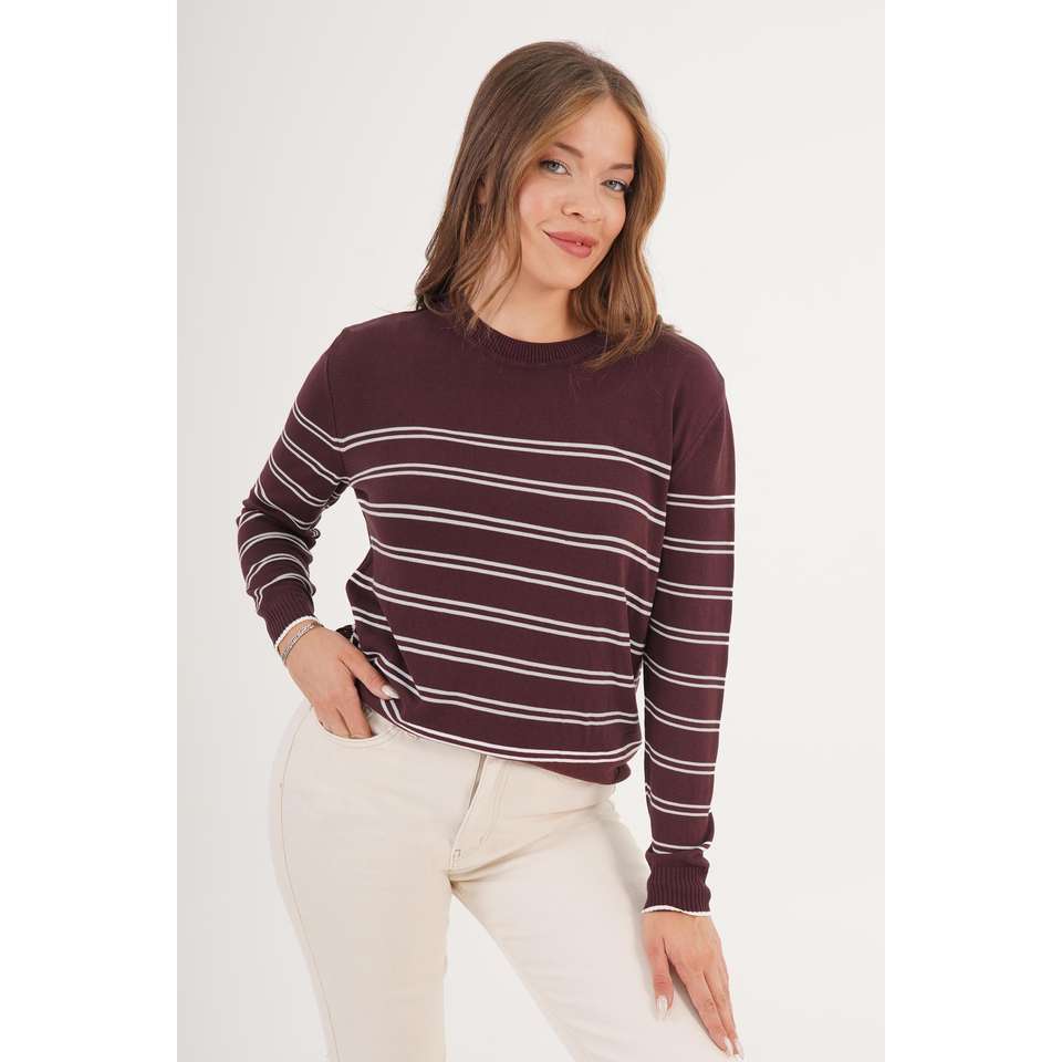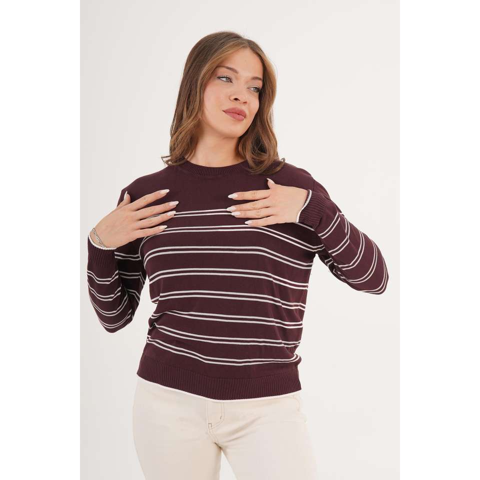 เสื้อสเวตเตอร์ไหมพรมคอกลมลายทางสีน้ำตาลสำหรับผู้หญิง แขนยาว สวมใส่สบาย ไม่เป็นขุย 14 กรัม