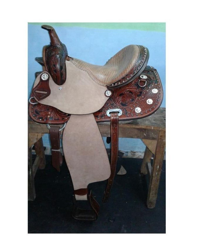อานม้าหนังแท้สีน้ำตาลคุณภาพพรีเมียมสำหรับขี่ม้าแบบตะวันตก ผลิตโดยผู้ผลิตและผู้ส่งออกชาวอินเดีย ทนทานและสวยงาม