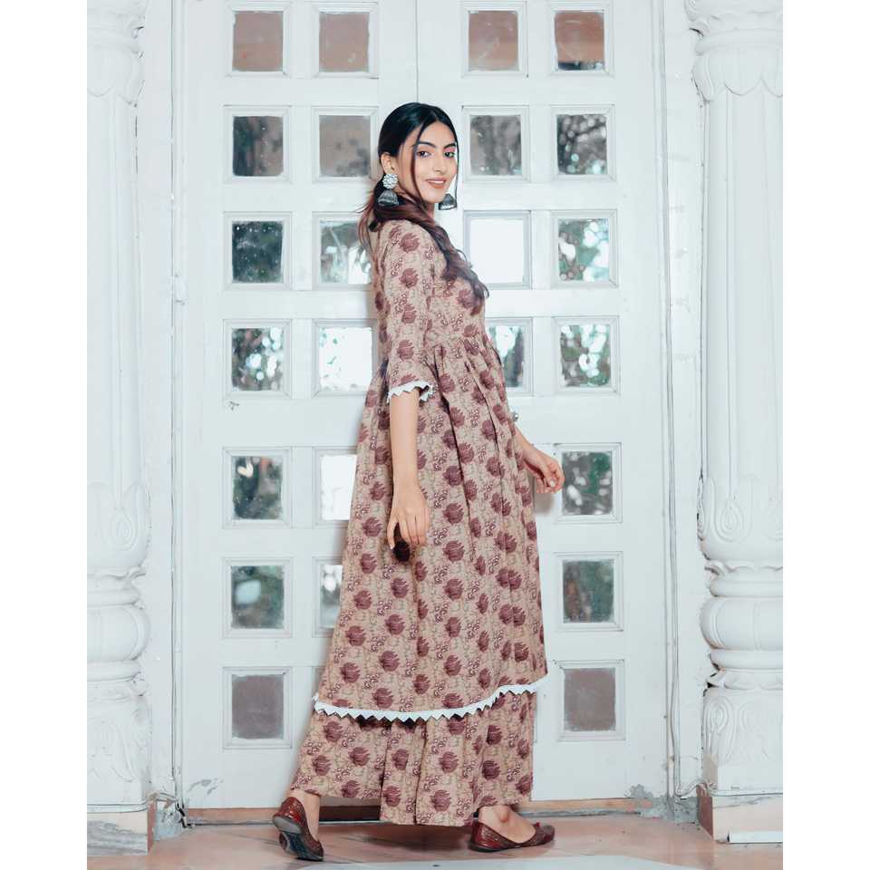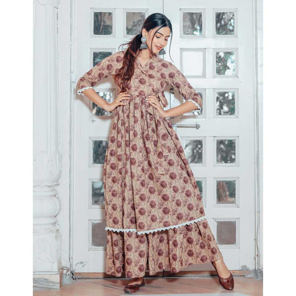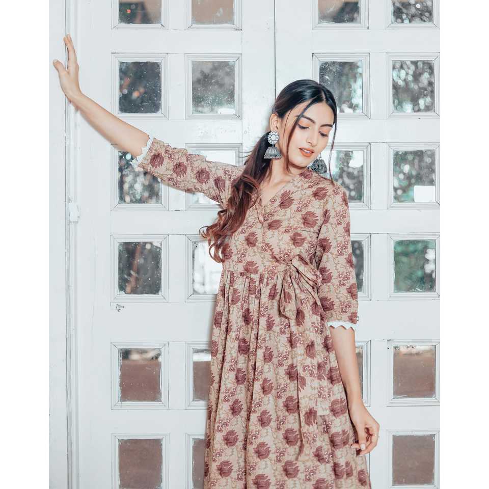 ชุดคุร์ตาลายดอกไม้สีน้ำตาลอมม่วง แขนสามส่วน ไซส์ XS