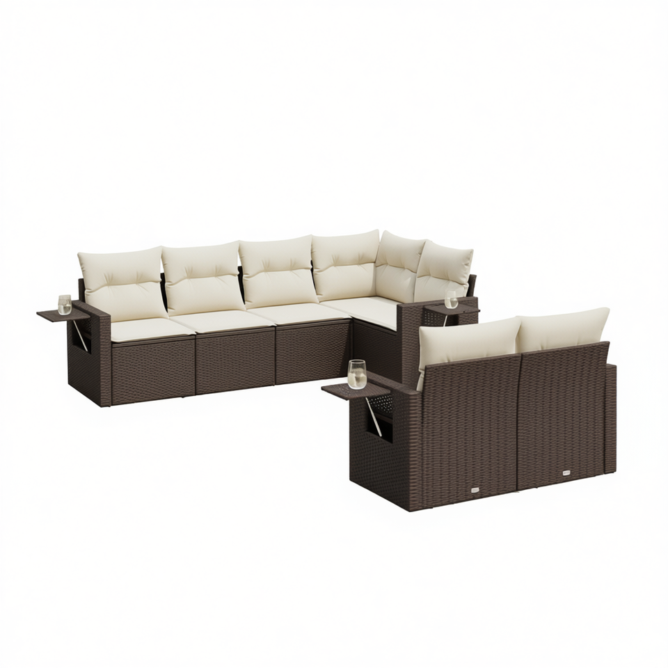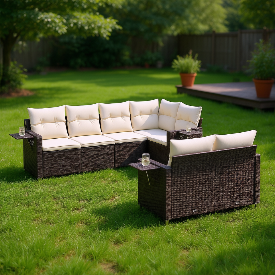 ชุดโซฟาหวายสีน้ำตาลสำหรับสวน โครงเหล็กเคลือบสีฝุ่น เฟอร์นิเจอร์กลางแจ้ง ดีไซน์ร่วมสมัย กันน้ำ พร้อมเบาะโฟมความหนาแน่นสูง