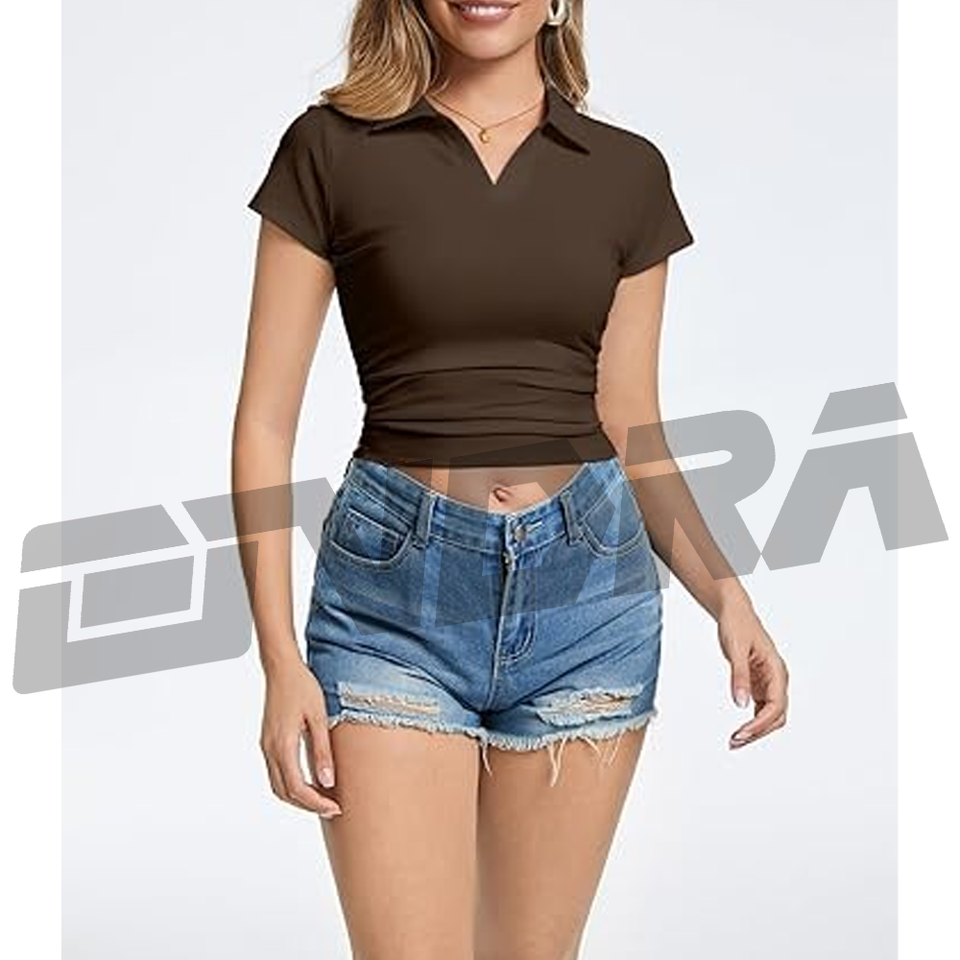 เสื้อโปโลครอปสีน้ำตาลสำหรับผู้หญิง ผลิตจากผ้าเนื้อนุ่ม ระบายอากาศได้ดี ดีไซน์ทันสมัย ทรงพอดีตัว เหมาะสำหรับใส่ลำลอง ทำงาน เดินทาง หรือใส่ในชีวิตประจำวัน