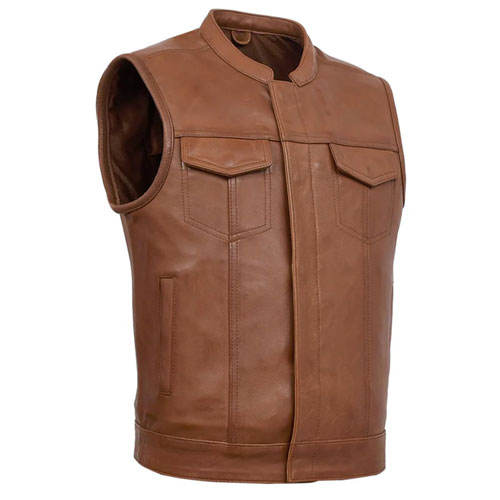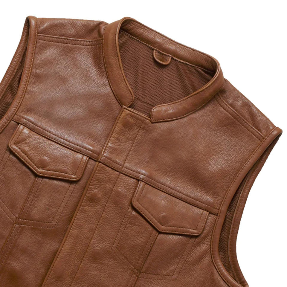 Brown Vintage Chestnut Men's Leather Cowhide Vest O-Neck Covered Button Closure Autumn Breathable Outerwear