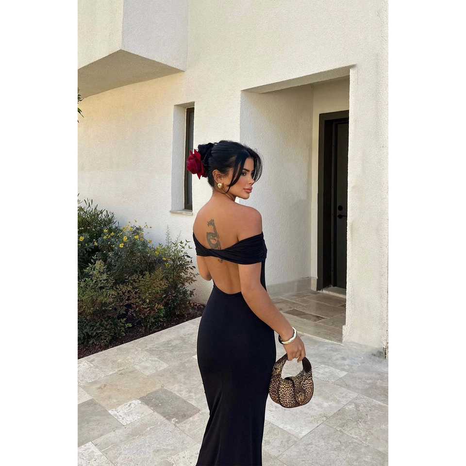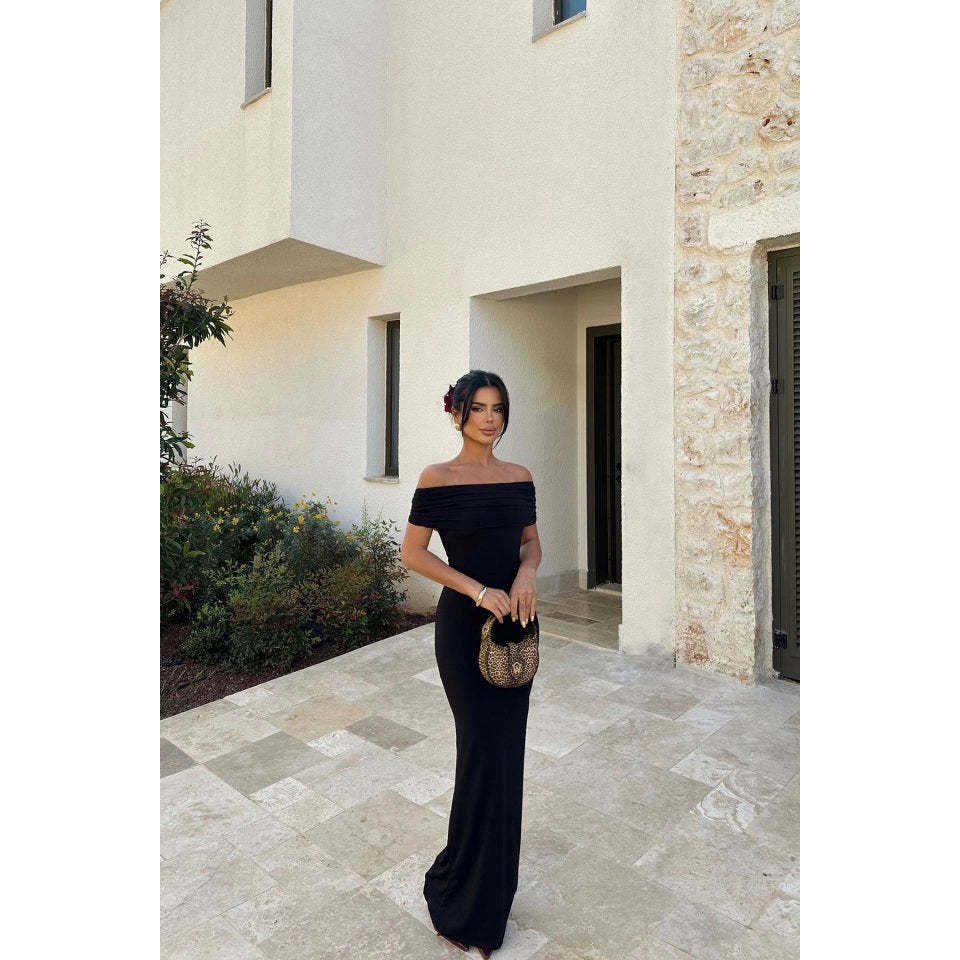 บรูเนลลา แบล็ค บอลกาวน์เดรสยาว เอวทรงเอ็มไพร์ แขนสั้น สไตล์เรียบง่าย โพลีเอสเตอร์ ไซส์ XL สำหรับงานพรอม