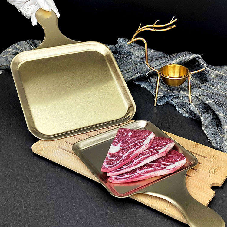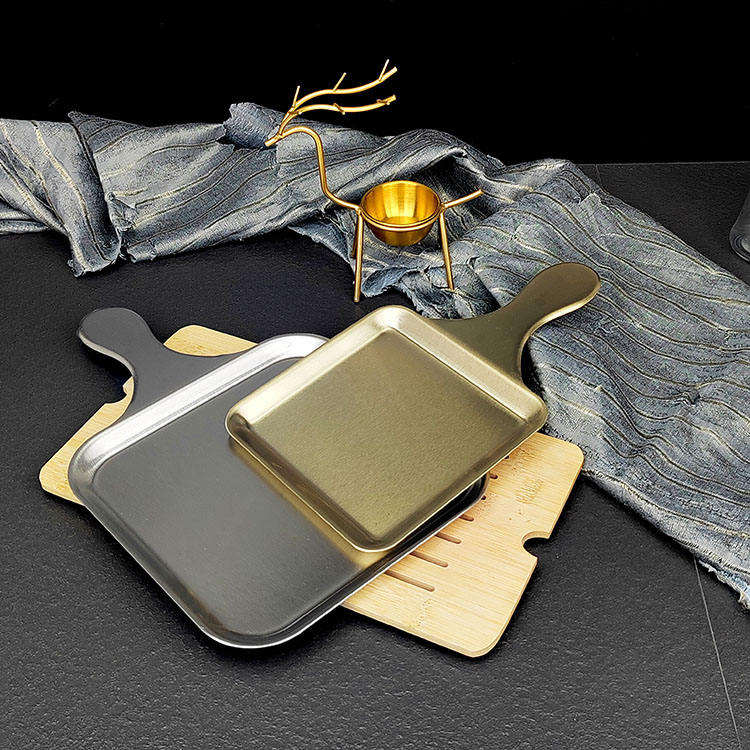 จานเสิร์ฟสแตนเลสสีทองขัดเงาพร้อมหูจับ ถาดสเต็ก ถาดของหวานสไตล์นอร์ดิก จานแบนสำหรับอาหารเรียกน้ำย่อย ภาชนะสำหรับร้านอาหารตะวันตก