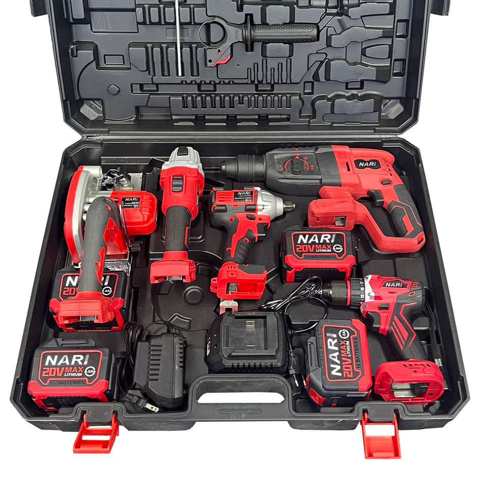 ชุดเครื่องมือไร้สาย 5 in 1 แบบไร้แปรงถ่าน ประกอบด้วย ประแจบล็อกไร้สาย สว่านกระแทก เครื่องเจียร เครื่องตอกตะปู เลื่อยวงเดือน