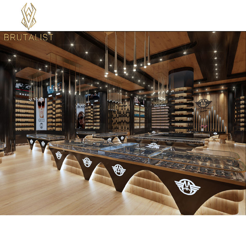 ชั้นวางแว่นตาไม้แบบ Brutalist รับผลิตตามแบบ OEM ODM ชั้นวางโชว์แว่นกันแดด โซลูชั่นครบวงจรสำหรับร้านค้าปลีก