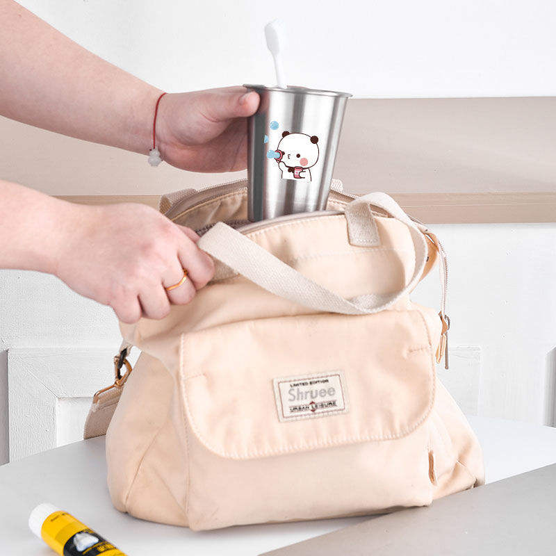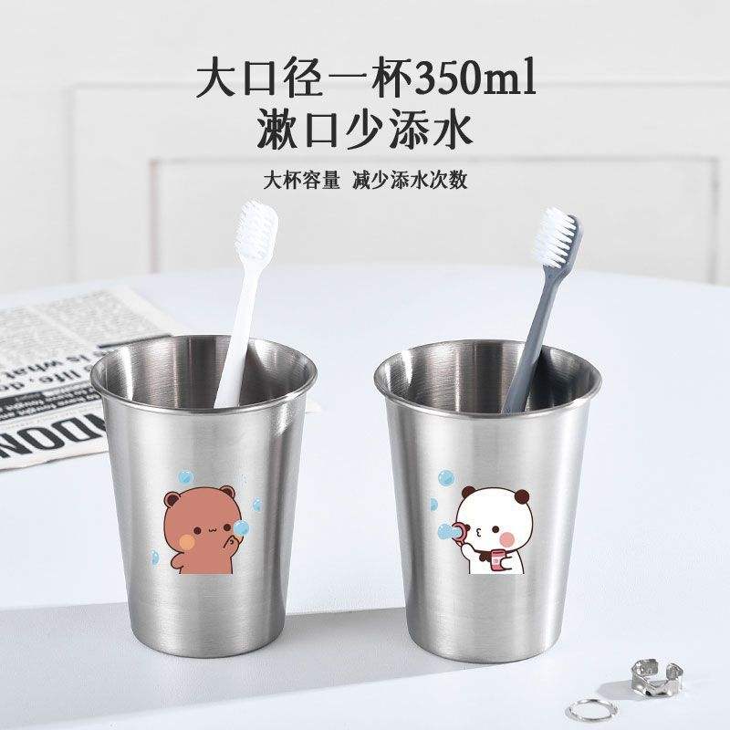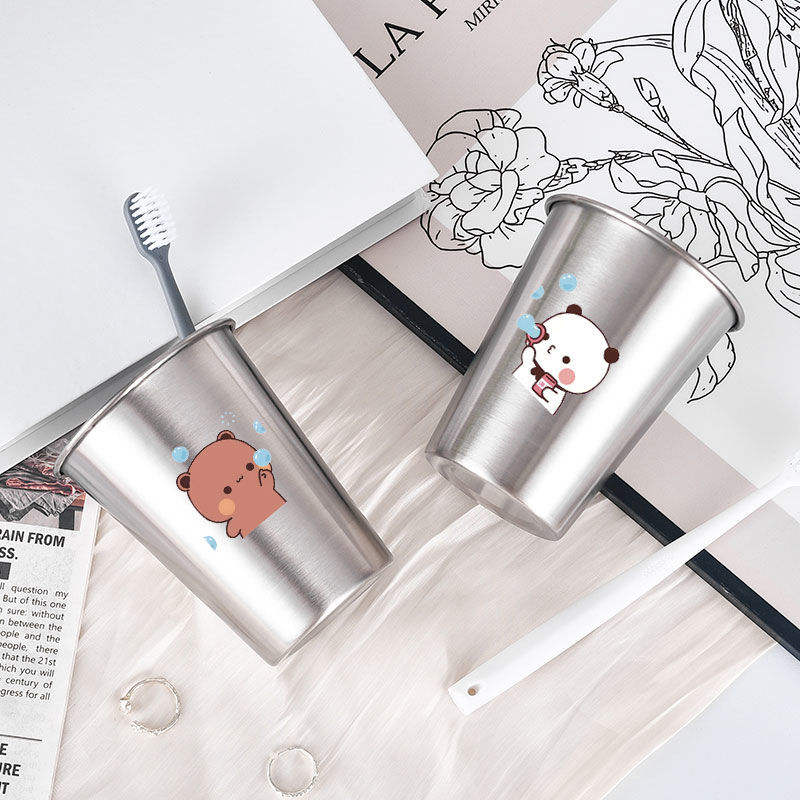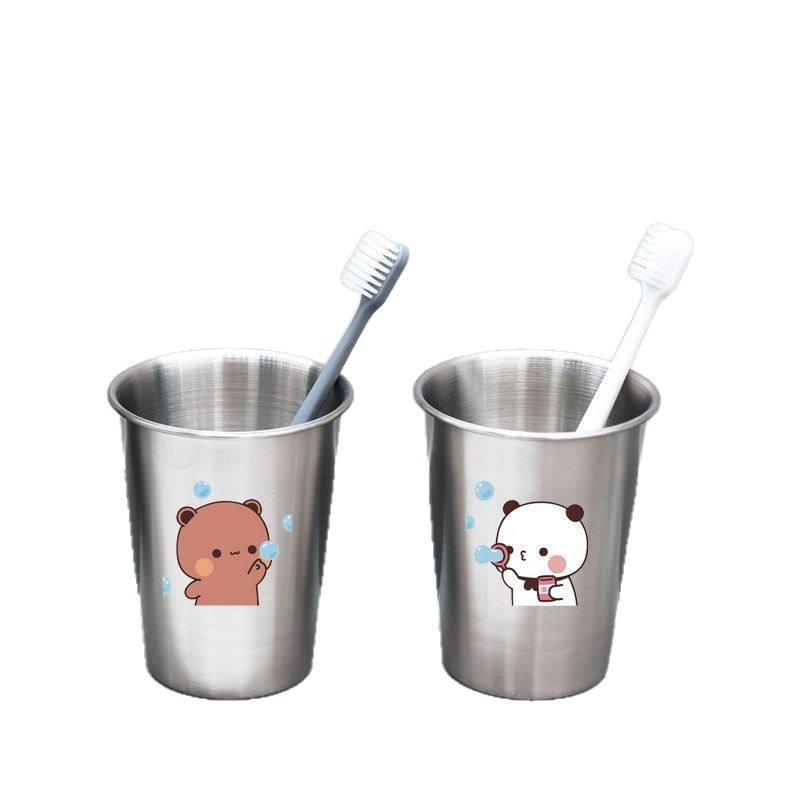 แก้วแปรงสีฟันสแตนเลสบับเบิ้ลแบร์ชุดคู่ ดีไซน์การ์ตูน แก้วล้างปากแบบเรียบง่ายสำหรับใช้ในห้องน้ำ