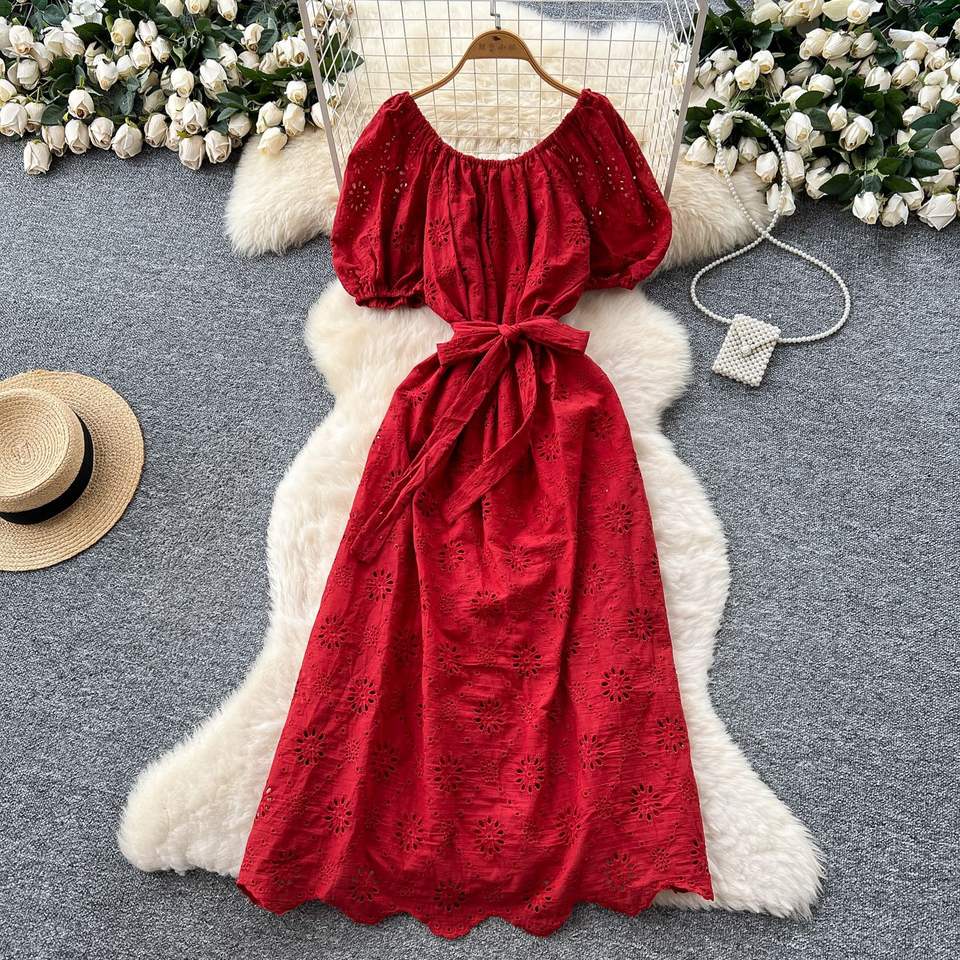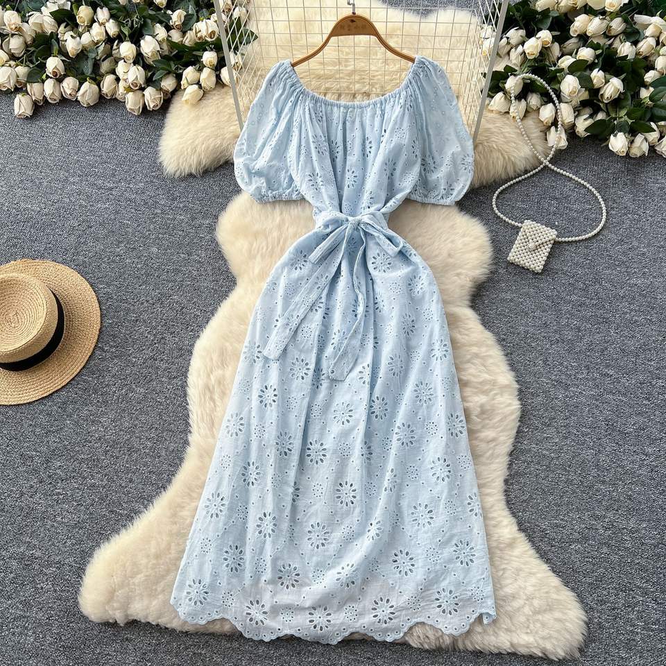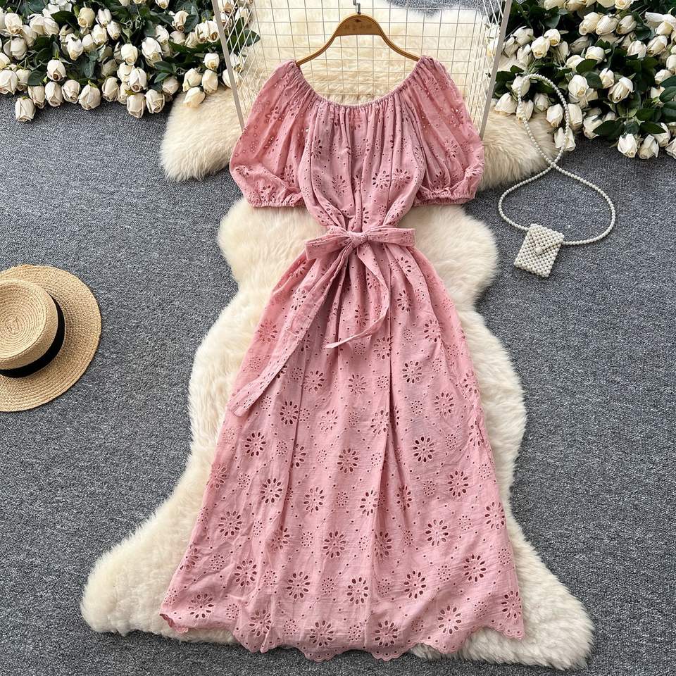 เดรสไหล่ข้างเดียวแขนพองสำหรับผู้หญิงในฤดูร้อนมีสายรัดเอวตะขอและดอกไม้แบบกลวง