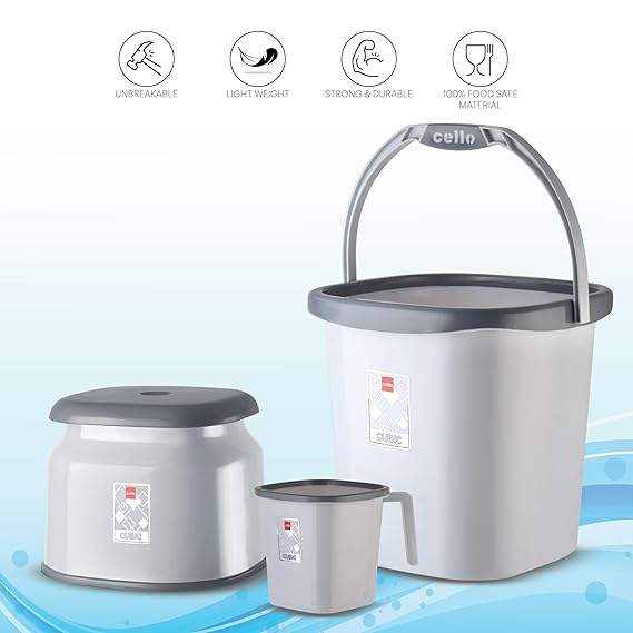 ชุดอุปกรณ์ห้องน้ำ ถังน้ำ 20 ลิตร + เก้าอี้ + แก้วน้ำ 1.5 ลิตร แข็งแรง ทนทาน น้ำหนักเบา ทำความสะอาดง่าย ดีไซน์สวยงาม ชุด 3 ชิ้น พลาสติก สีเทา