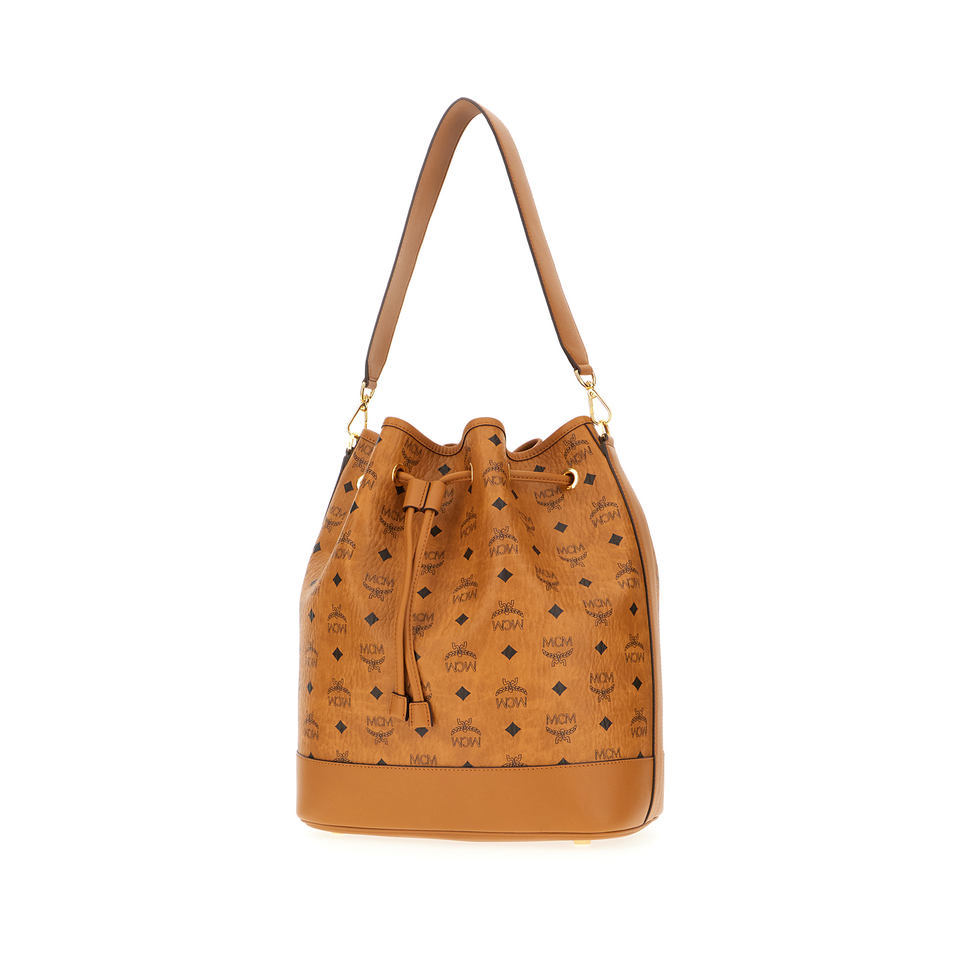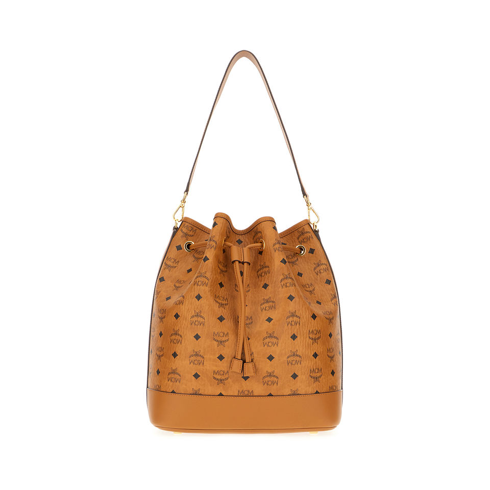 กระเป๋าทรงถังรับรู้ในหนังสังเคราะห์ที่มีการแทรกหนัง Nappa บนขอบที่โดดเด่นด้วยการพิมพ์ Visetos บนส่วนบน