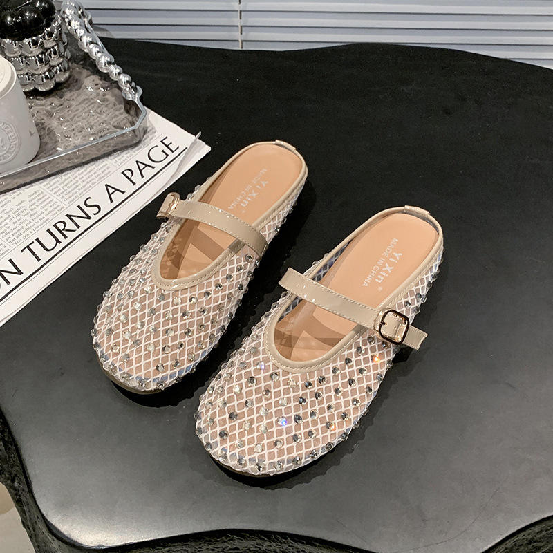 Buckle Strap Mary Jane Women's Shoes 2025 Summer New Luxury Rhinestone Ballet Flats Mesh Breathable Women's Half Top Shoes
