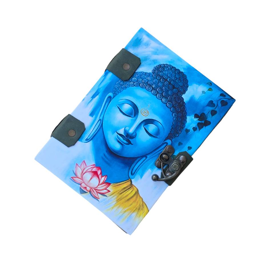 สมุดบันทึกปกแข็งพิมพ์ลายพระพุทธเจ้าพร้อมตัวล็อคโลหะและหน้ากระดาษสีสนิม ขนาด 7 นิ้ว X 5 นิ้ว 100 หน้า