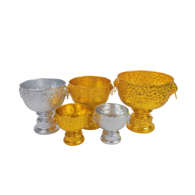 ชามหัวสิงโตสำหรับชาวพุทธดีไซน์แบบไทยทำจากอลูมิเนียมทรงกลมสีทอง18ซม. ผลิตในประเทศไทย