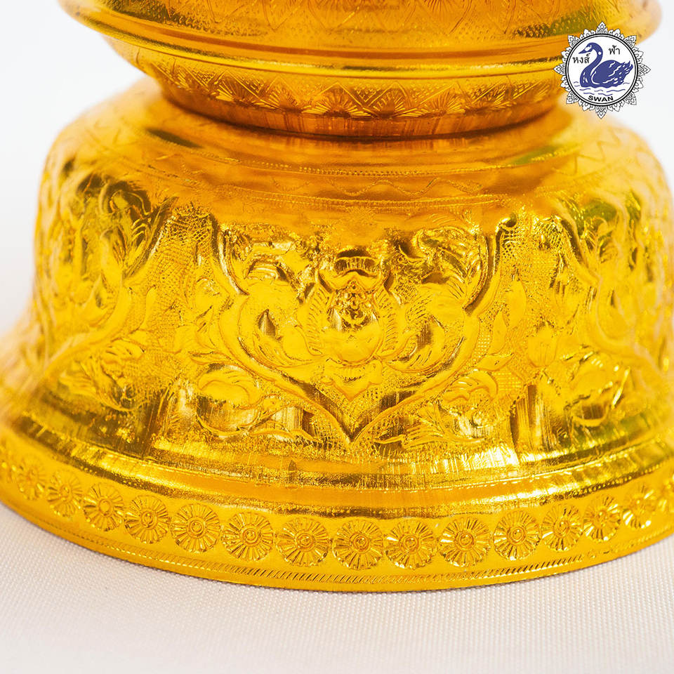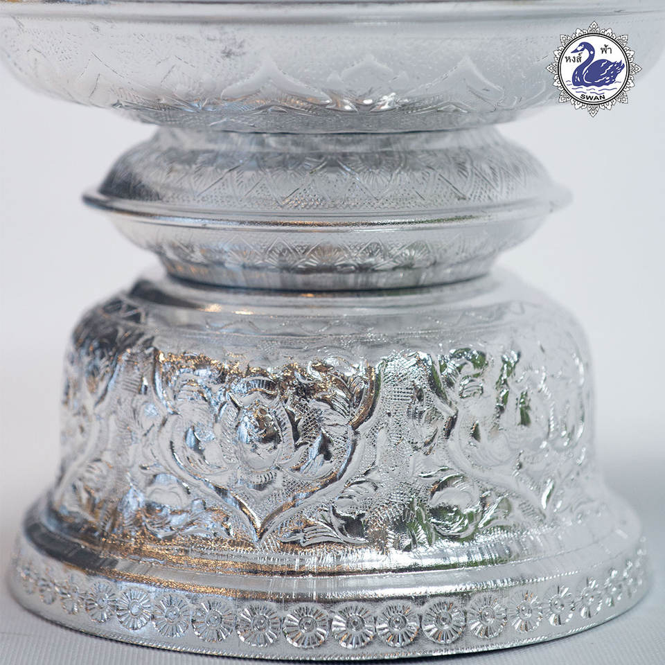 จานเสิร์ฟลายพิมพ์พุทธศาสนาไทย ฐานหวาย 14 ซม. อะลูมิเนียมสีทองเงินสำหรับใช้ในวัดจากประเทศไทย