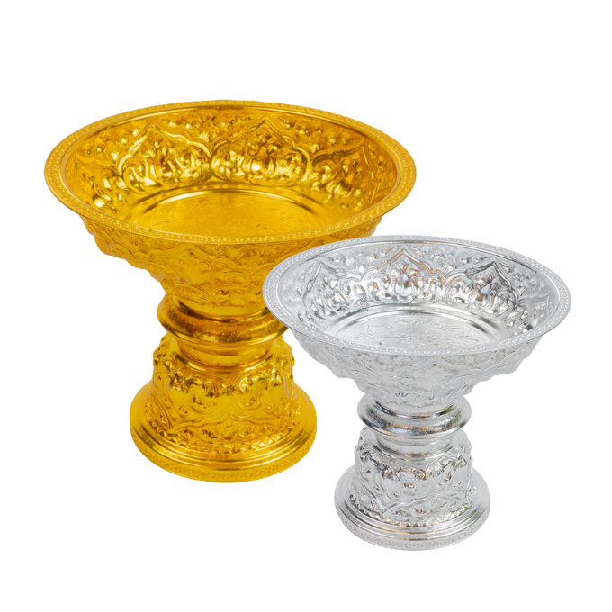พุทธศาสนาการออกแบบไทยให้บริการถาดพระราชแท่น30ซม. วัสดุอลูมิเนียมกลมสีเงินทองสำหรับให้บริการในประเทศไทย