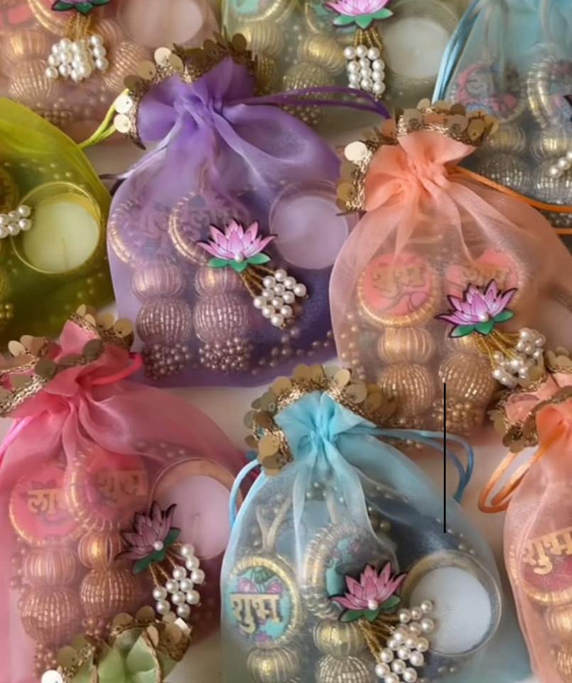ชุดของขวัญเทศกาลที่มีผู้ถือชา shubh labh แขวนคู่และดอกบัว organza potli ที่สมบูรณ์แบบสำหรับทุกโอกาส