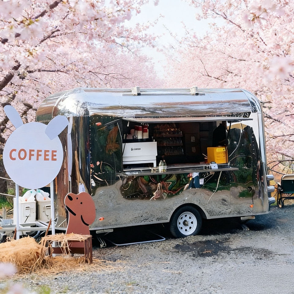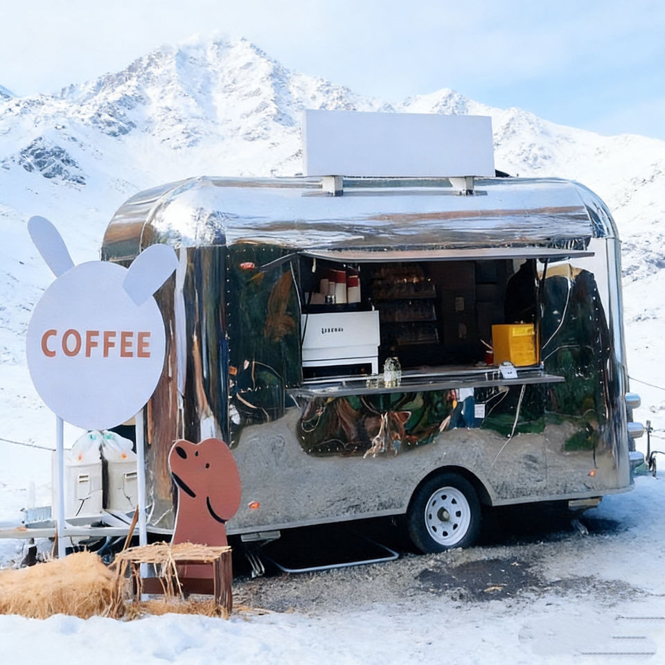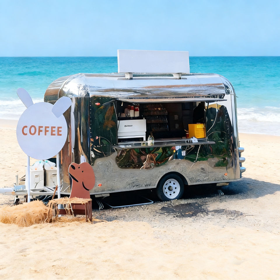 รถพ่วงจัดเลี้ยงทรงโค้งมน ผลิตจากสแตนเลสสตีลขัดเงา พร้อมหน้าต่างบริการแบบเปิดสำหรับขายกาแฟและขนม