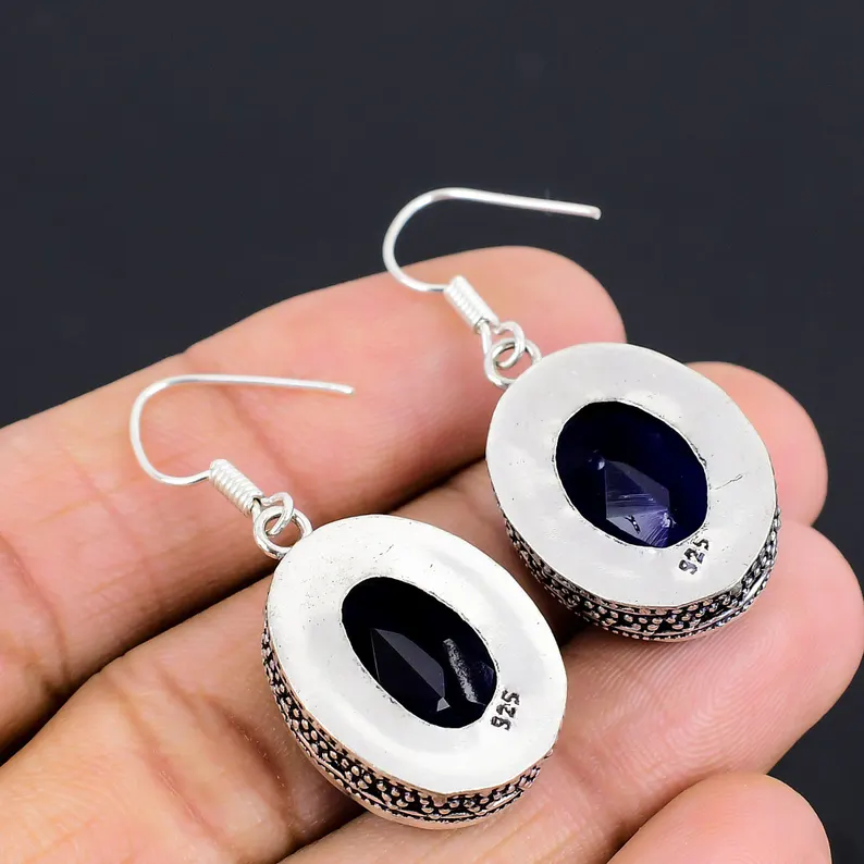 ต่างหูไพลินสีน้ำเงินจำนวนมากทำด้วยมือ925เงินสเตอร์ลิงต่างหูรูปไข่วินเทจแบบห้อยตุ้งติ้งของขวัญสำหรับราคาขายส่ง