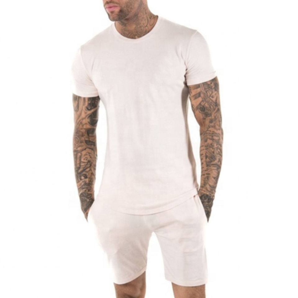 ชุดเซ็ตเสื้อยืดและกางเกงขาสั้นลำลองผู้ชายสำหรับฤดูร้อน ผ้าคอตตอนผสม พิมพ์โลโก้ เอวยางยืด กันยับ แห้งเร็ว ระบายอากาศได้ดี