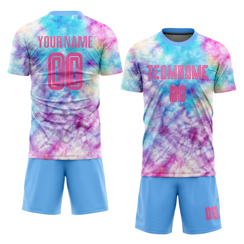 ชุดฟุตบอลแบบกำหนดเองจำนวนมาก พิมพ์ลายดิจิตอลแบบ Tie Dye พร้อมชื่อและหมายเลข ชุดยูนิฟอร์มฟุตบอล รับผลิตตามสั่งจำนวนมากจากผู้ผลิต OEM