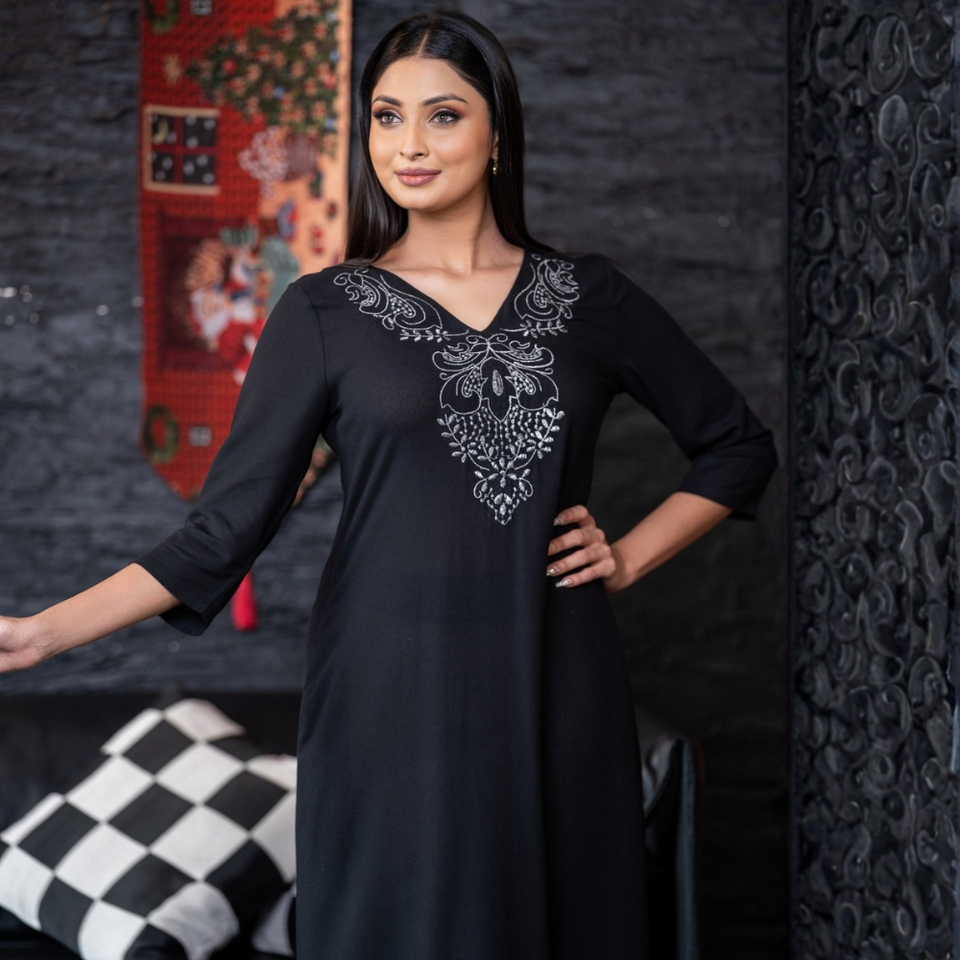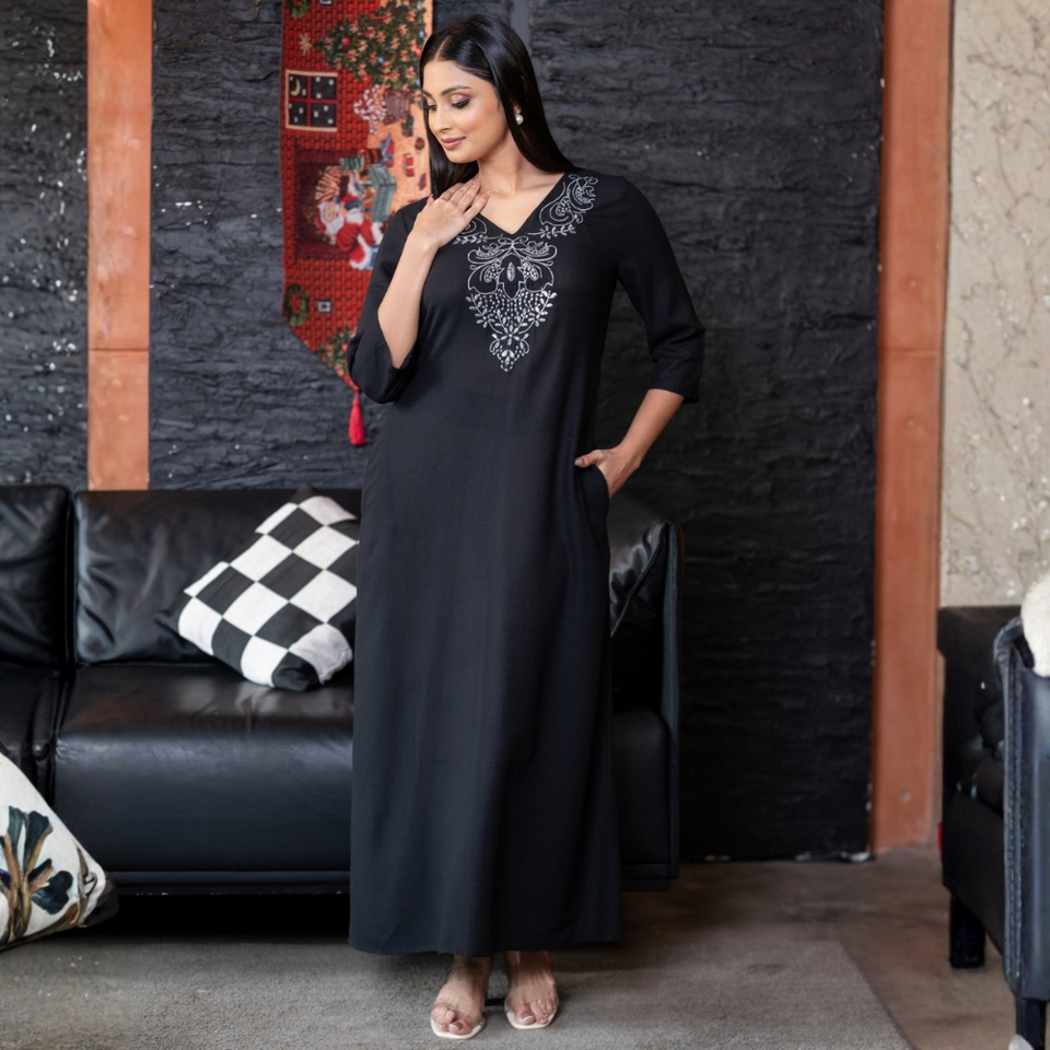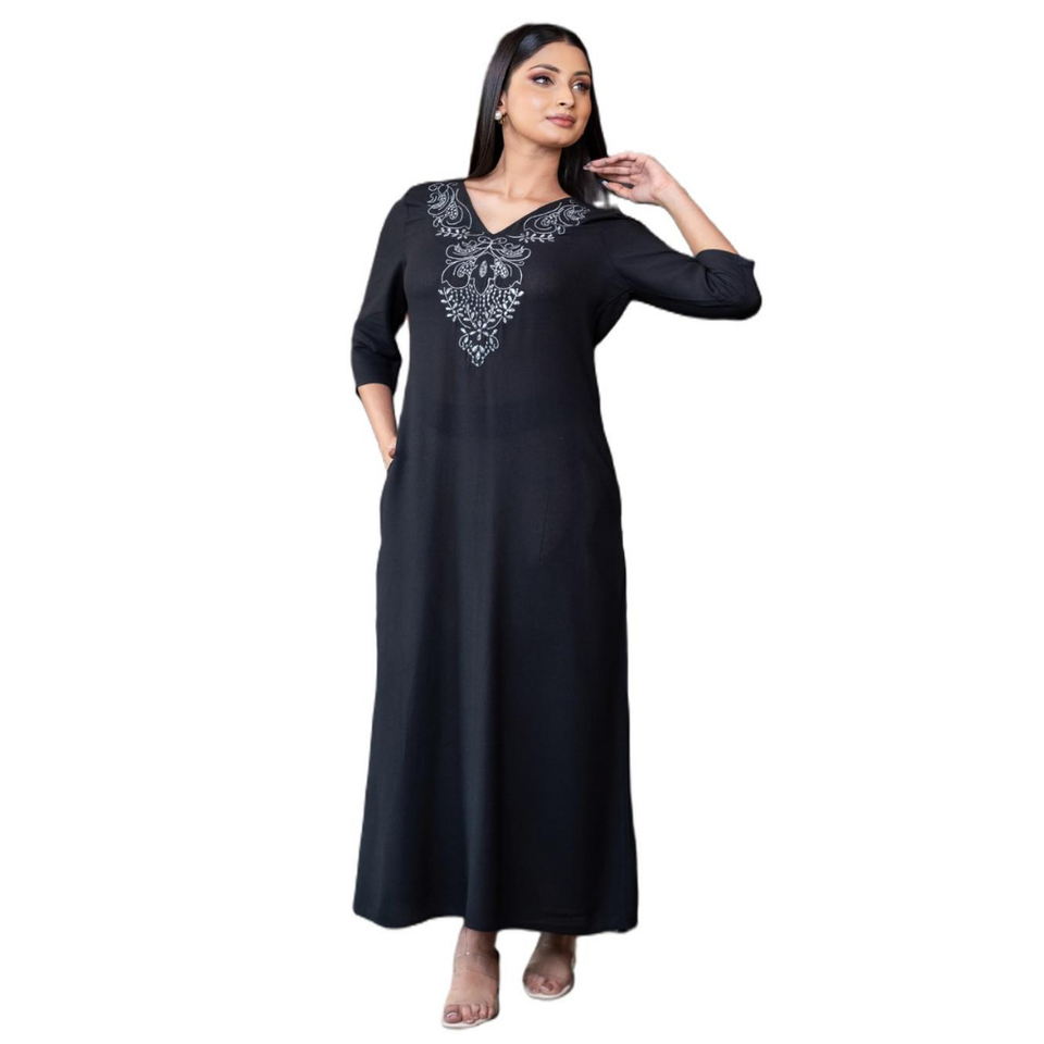 ชุดเดรสลำลองผ้าลินินสำหรับผู้หญิง ดีไซน์หรูหรา ทนทาน ขนาด 51 นิ้ว พร้อมรายละเอียดเมทัลลิก