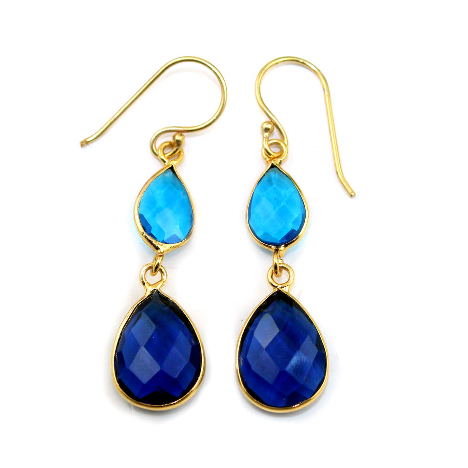 ต่างหูตะขอชุบทองจำนวนมากต่างหูควอตซ์แทนซาไนต์สีฟ้าสไตล์ลอนดอนเครื่องประดับอัญมณีทองเหลืองทรงลูกแพร์