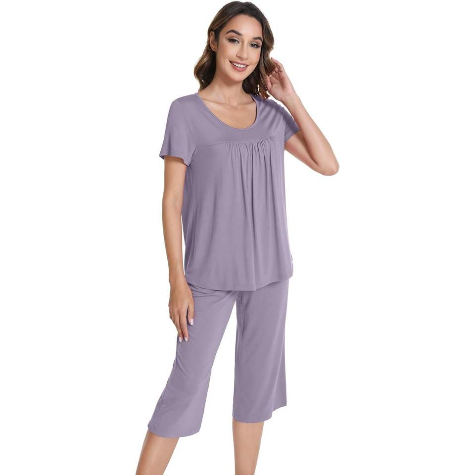 ชุดนอนผู้หญิงผ้าวิสโคสจากใยไผ่ เนื้อผ้านุ่มเย็นสบาย แขนสั้น กางเกงขายาวแบบคาปรี ชุดนอนลำลองสำหรับผู้หญิง