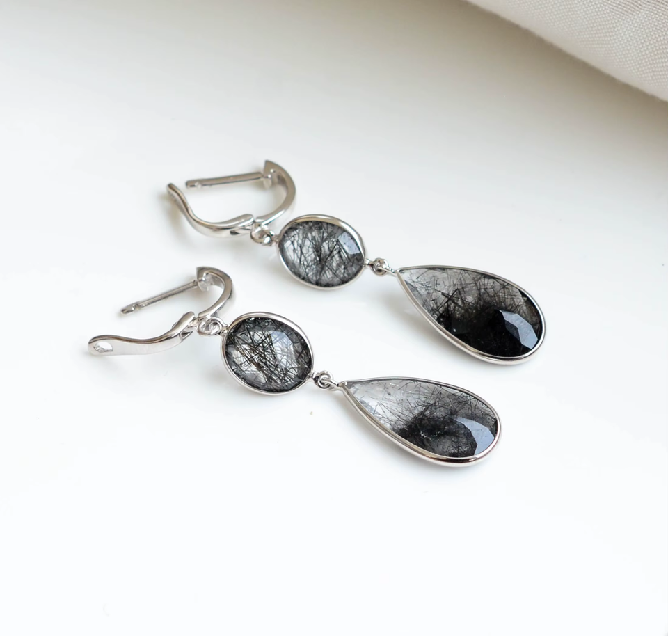 ต่างหูห้อยประดับควอตซ์สีดำลายเส้นรูทิเลเต็ดแบบมีน้ำหนัก พร้อมเงินแท้ 925 สไตล์ทันสมัยสำหรับผู้หญิง มีจำหน่ายแล้ว