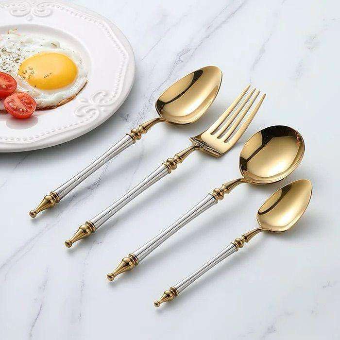 ชุดช้อนส้อมสแตนเลสแบบแบนจำนวนมาก พร้อมดีไซน์ทันสมัยเคลือบทอง ชุดช้อนส้อมสแตนเลสแบบแบนทำมือสำหรับขาย