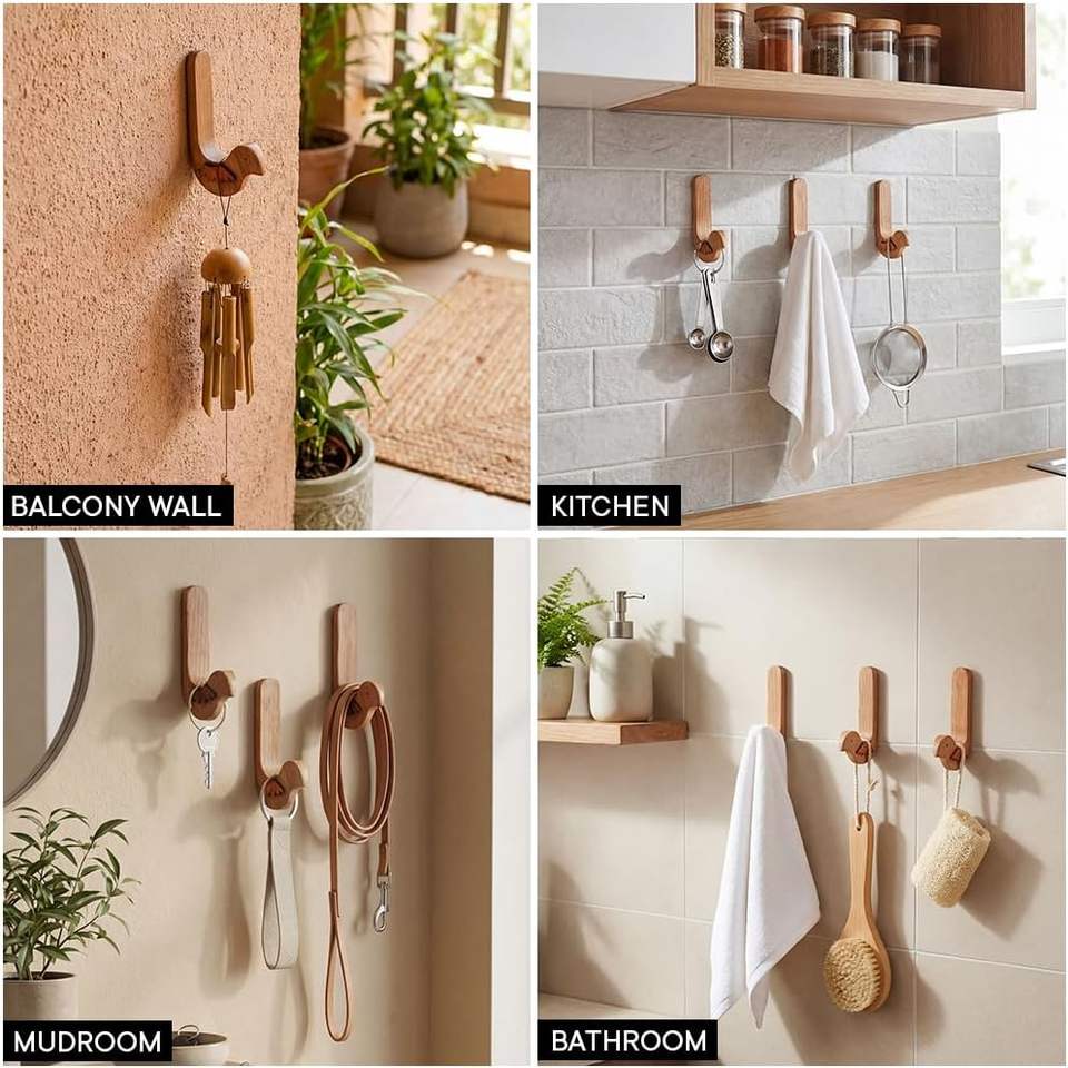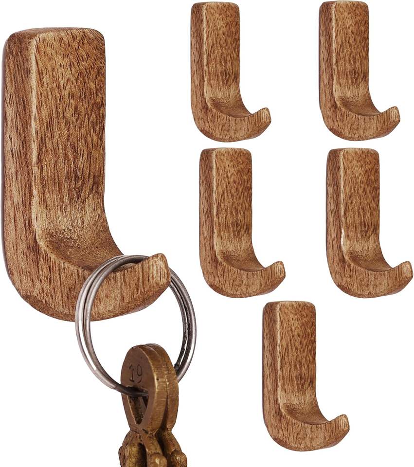 ตะขอแขวนผนังไม้ธรรมชาติขนาดเล็กแบบไม่ต้องเจาะ 6 ชิ้น