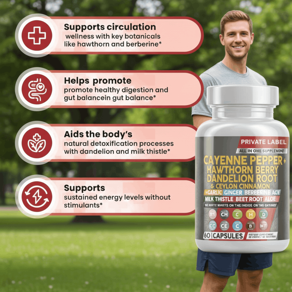 แคปซูลสารสกัดจากผลฮอว์ธอร์นแบบบรรจุภัณฑ์ขนาดใหญ่ พร้อมสารสกัดจากพริกไทยแดง แคปซูลเสริมสุขภาพพร้อมสารสกัดจากดอกแดนดิไลออนและสารสกัดจากพืชต่างๆ