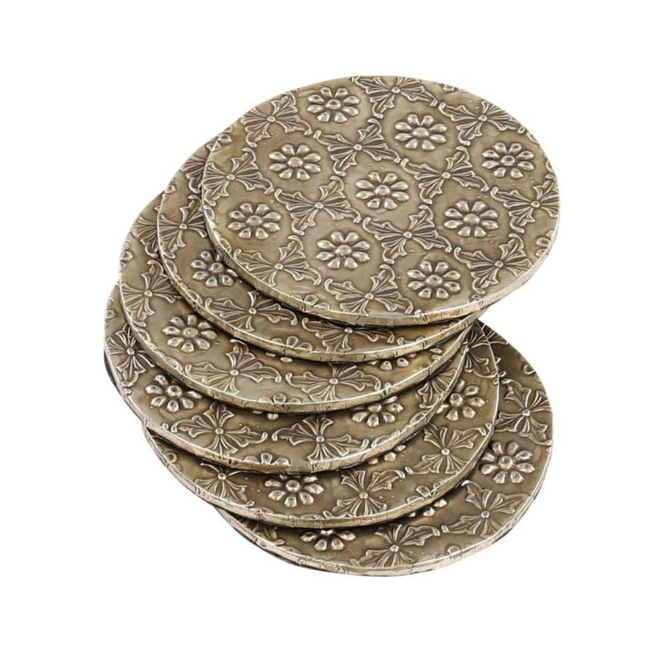 แผ่นรองแก้วโลหะสีทองทันสมัยแบบขายส่งจำนวนมาก ดีไซน์ลายตอกแบบหรูหรา ทนความร้อน ป้องกันพื้นผิวโต๊ะ เหมาะสำหรับร้านอาหาร