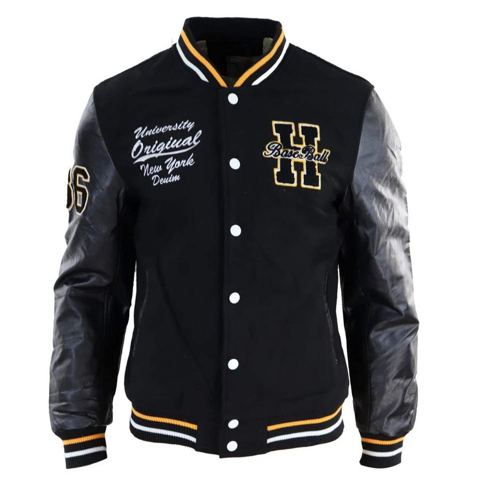 แจ็คเก็ตวาร์ซิตี้ขนสัตว์สำหรับผู้ชาย ตัวเสื้อทำจากขนสัตว์คุณภาพสูง แขนทำจากหนัง PU ปิดด้วยกระดุมแป๊ก แจ็คเก็ตเลตเตอร์แมนแบบกำหนดเองสำหรับวิทยาลัย