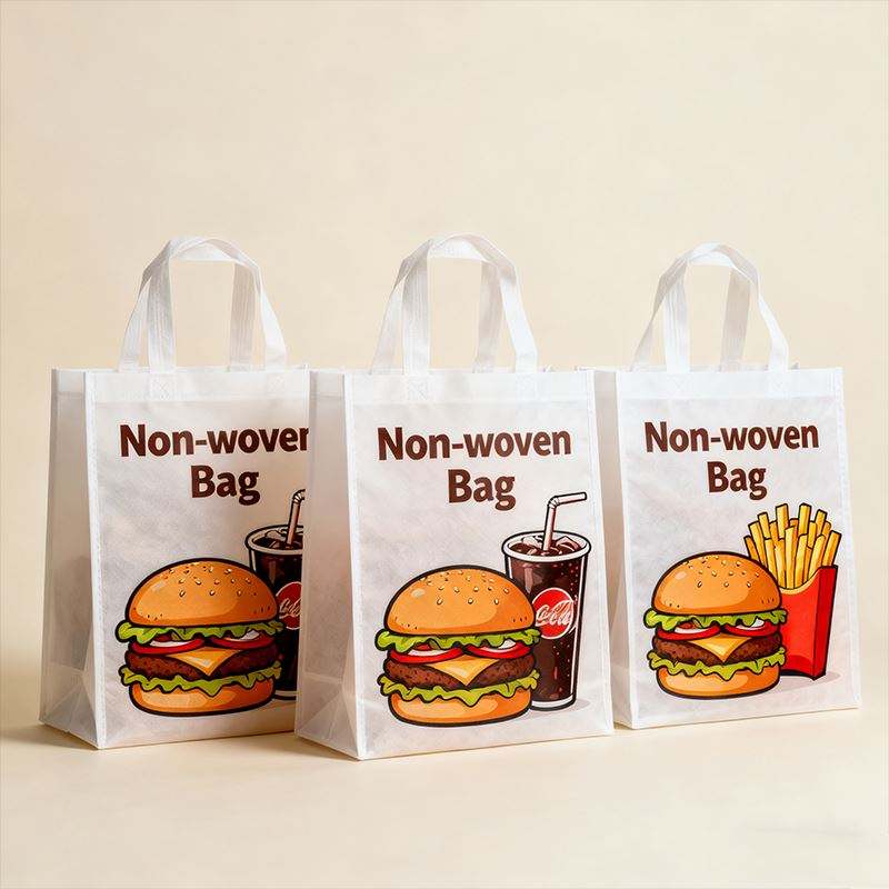 ถุงผ้าไม่ทอพิมพ์ลายเบอร์เกอร์และเครื่องดื่ม สำหรับส่งอาหารจานด่วน ใช้ในงานจัดส่งประจำวัน ร้านอาหาร ใช้ส่วนตัว ดีไซน์สวยงาม