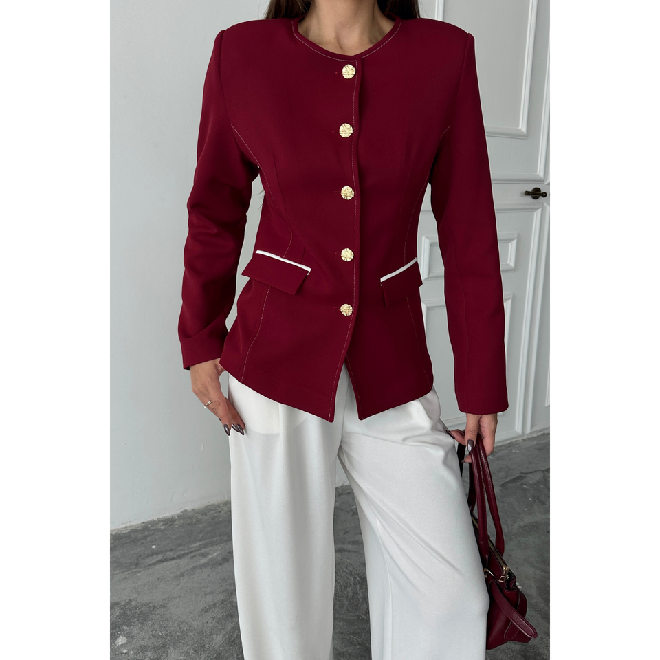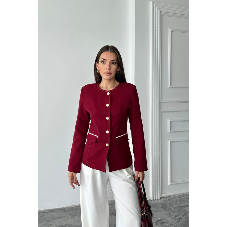 เสื้อเบลเซอร์คอปกทรงครูว์ แบรนด์ Burgundy Balzer สำหรับผู้หญิง ดีไซน์หรูหรา พร้อมกระเป๋าและลายปัก